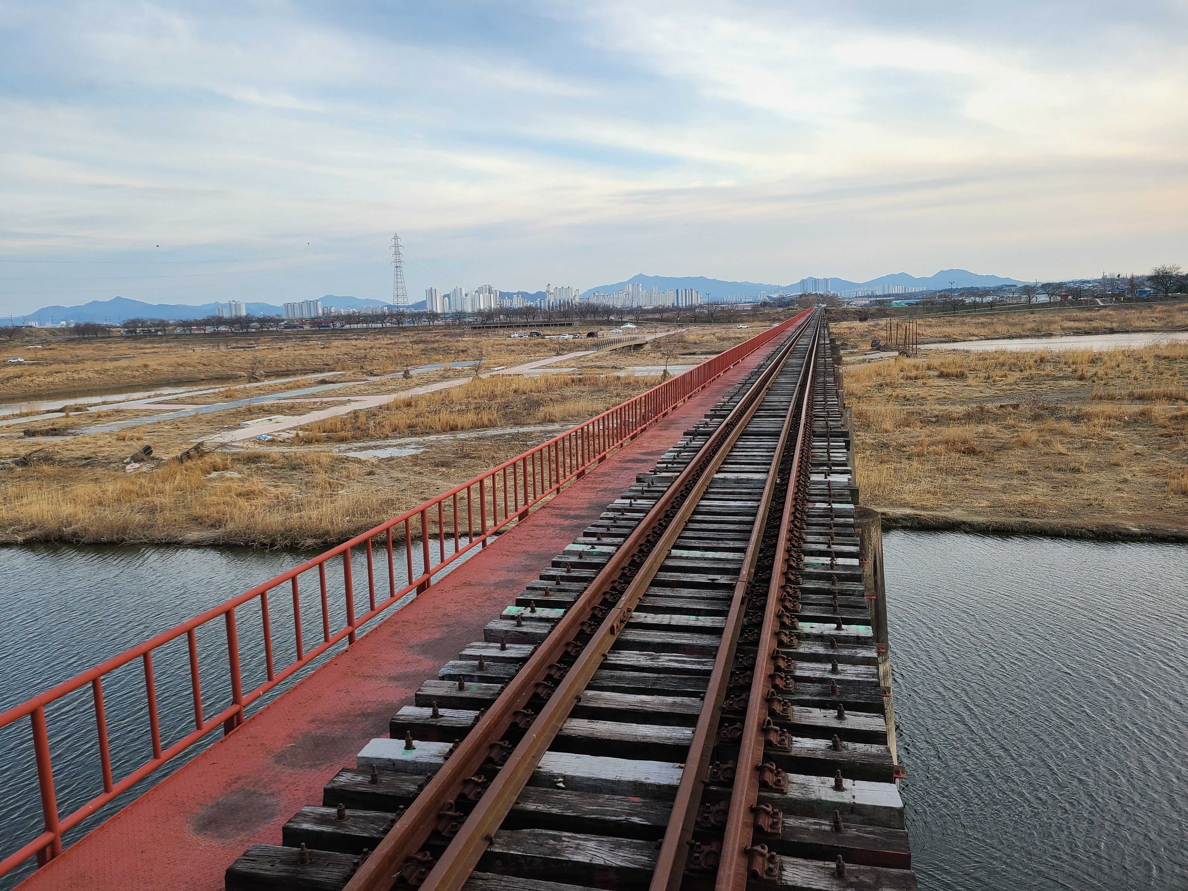 산속등대를 돌아보고 나니 시간은 어느 덧 5시 즈음이 되었다. 비비정으로 이동했다. 비비정은 만경 강가에 위치한 정자이다. 40~50년 전 까지만 해도 만경 강가에는 백사장이 펼쳐져 있었다고 한다. 비비정을 사이에 두고 전라선 철교와 폐철교를 바라보고 있으니 시간이 흐른다는 것의 의미를 생각하게 되었다. 우리 집 식구와 아무 말없이 폐철교의 끝을 바라보며 시간을 보냈다.