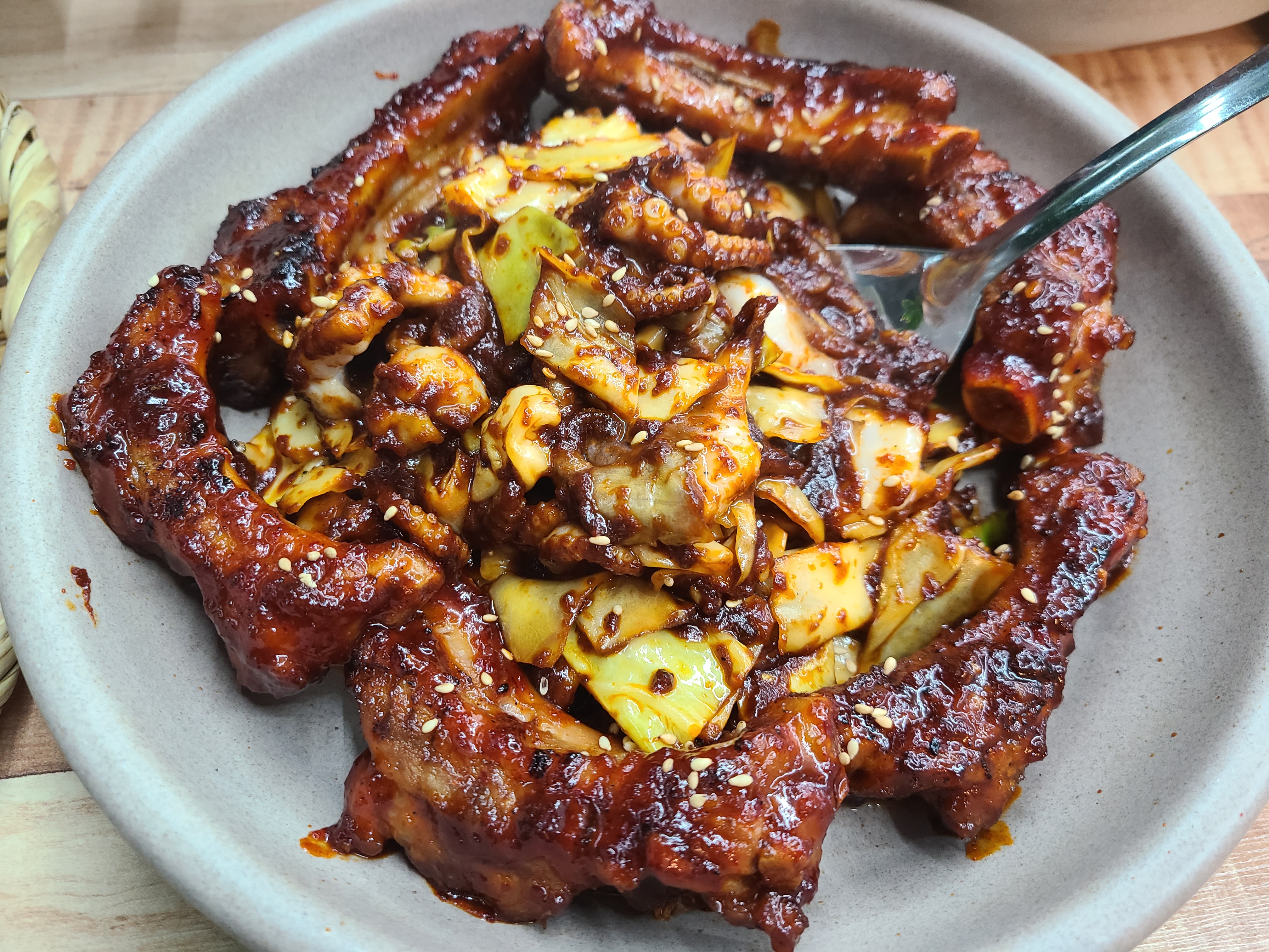 우리 집 식구는 이제야 우리가 어디서 자야 하는지 걱정이 되는지 "우리 어디서 자 오늘?"이라며 물었다. 데일리호텔, 야놀자, 에어비엔비, 올스테이, 인스타를 정신없이 검색했지만 호텔과 리조트, 펜션 예약은 불가했다. 아쉬운 데로 호텔이라고 써 있는 모텔을 예약했고 호텔 와인으로 향하는 길에 청석골 쭈갈비에서 쭈갈비 세트를 저녁으로 먹었다. 고기라면 늘 행복해하는 우리 집 식구와 해산물을 좋아하는 내 입에 매콤 달콤한 쭈갈비 세트가 딱이었다. 한 가지 아쉬운 점은 늦은 저녁이라서 인지 밥이 오래된 듯한 느낌을 받았다. 아마도 코로나로 인해 손님 방문이 많지 않아 회전율이 떨어져 서가 아닐까 생각된다.