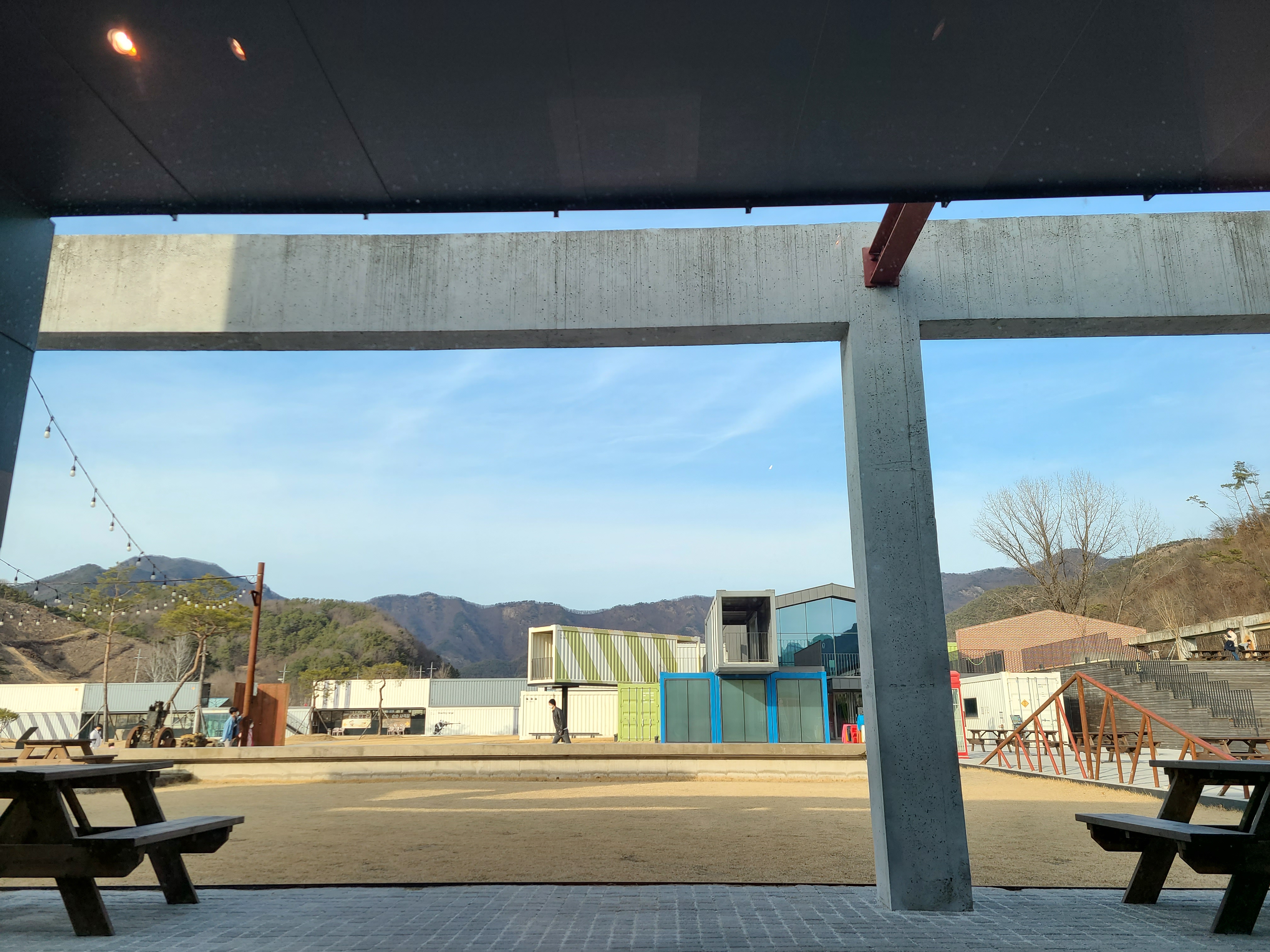 비비정을 나와 석양이 지는 모습을 보기 위해 캔버스 카페로 이동했다. 캔버스 카페 앞에 처음 도착했을 때 규모가 크다라는 생각이 들었다. 코너를 돌아 주차장으로 들어서면서 본 캔버스 카페의 모습이란 여기가 왜 인스타 핫플인지 이해할 수 있었다. 구석 구석 사진을 찍을 만한 포토 존이 구성되어 있었고, 통 유리 창으로 건물이 구성되어 있어서 탁 트인 풍경을 즐길 수 있었다. 우리가 방문 한 시간 대가 딱 석양이 지는 타이밍이어서 아름다운 석양을 원 없이 감상했다.
