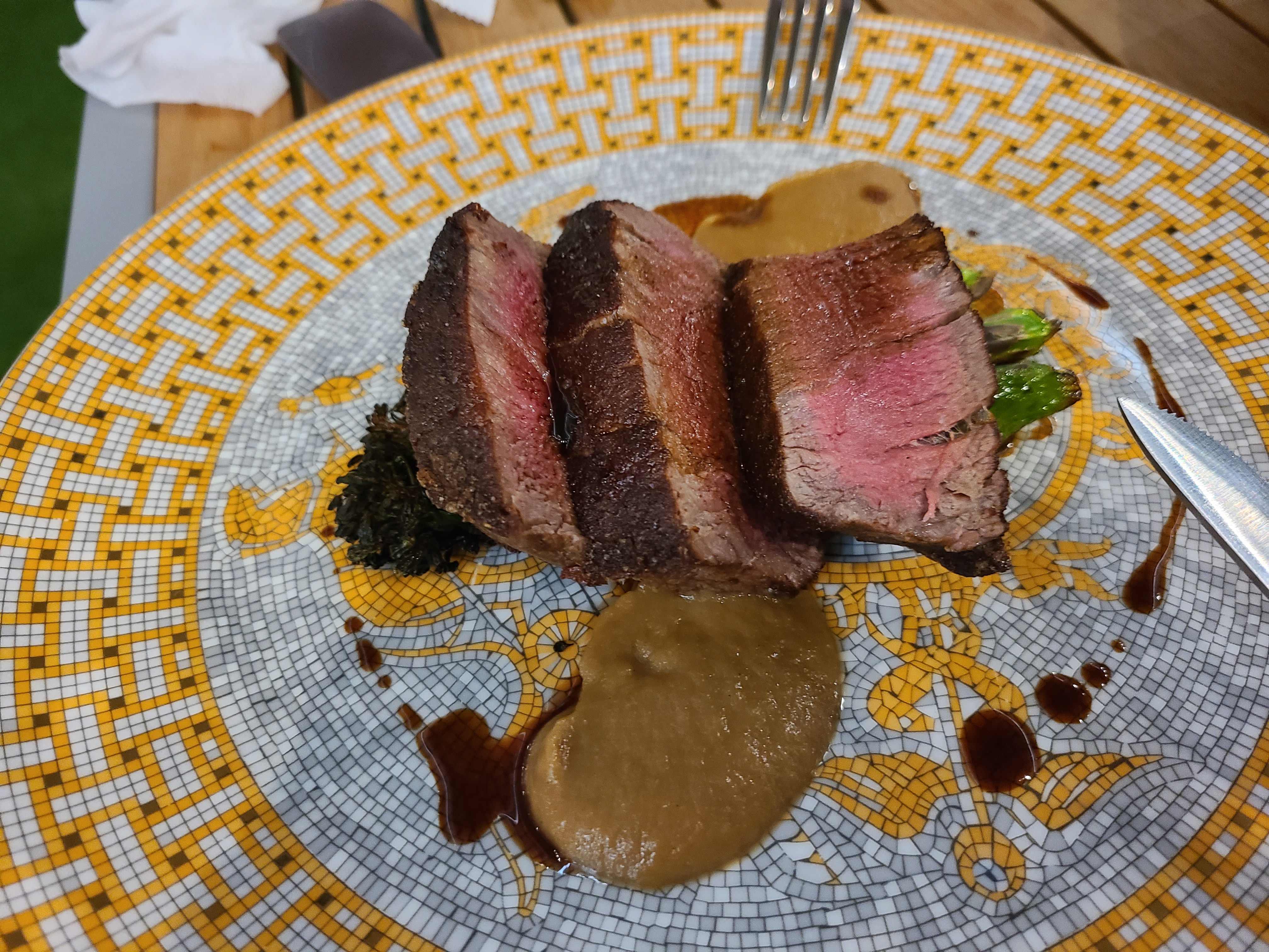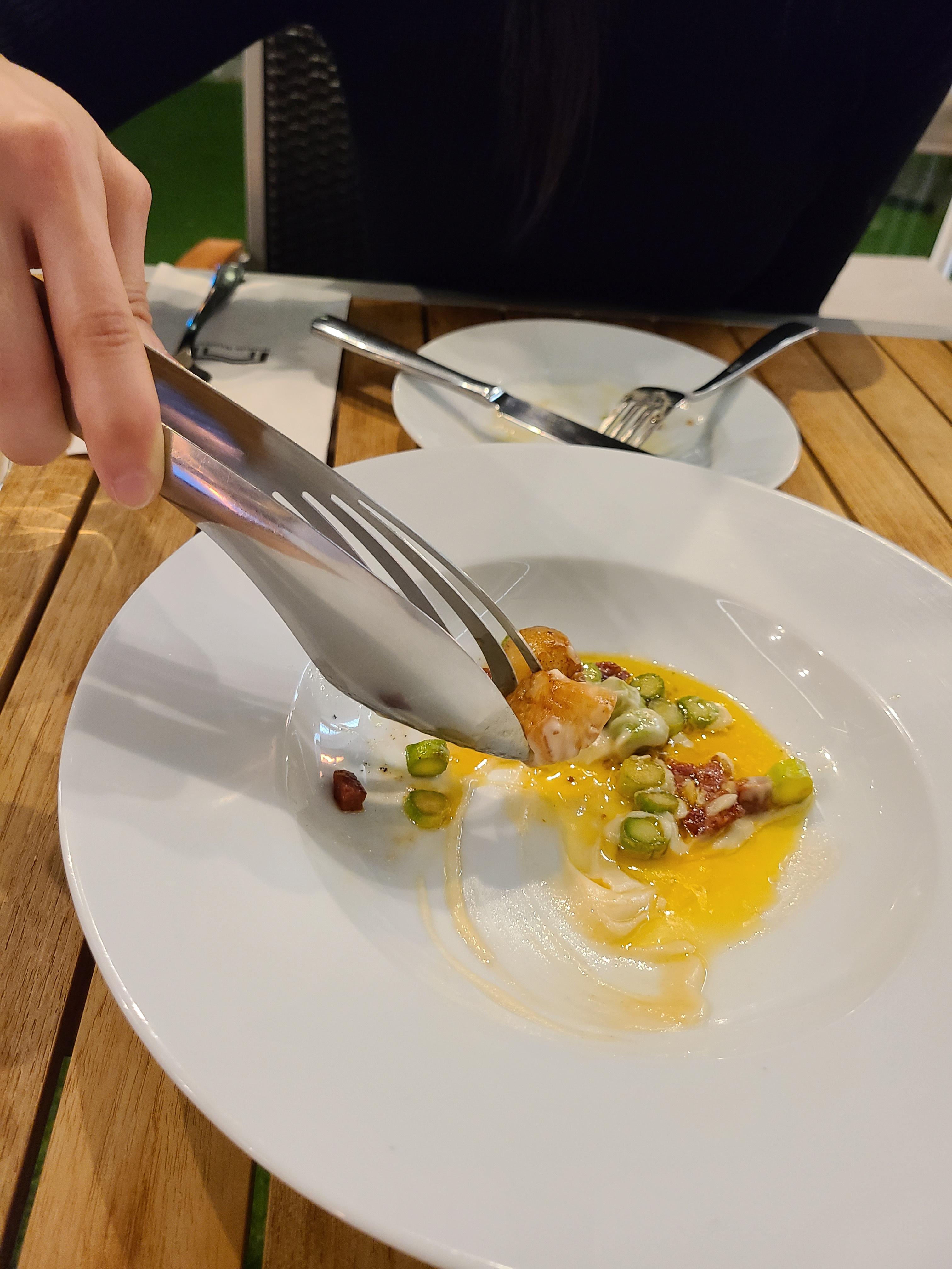 나는 한강 뷰를 우리 집 식구는 불 멍을 때리는 사이에 첫 번째 요리가 나왔다. 구운 아스파러거스와 관자, 유자소스의 비주얼에 반하고 맛에 또 한번 반했다. 관자의 익힌 정도도 적당해 식감이 매우 훌륭했다. 우리 집 식구와 감탄을 하며 맥주를 주문했다. 맛있는 음식을 먹으니 모든 아쉬움이 날아갔다.