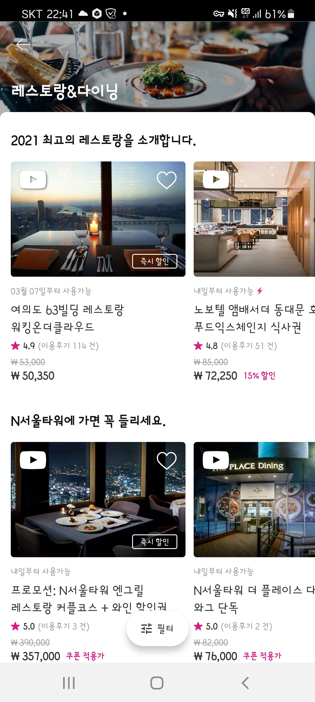 그래서 이번 생일에는 한강 뷰가 보이는 곳에서 저녁을 같이 먹고 싶다는 이야기를 미리 했다. 생일이 가까워 오니 우리 집 식구는 내가 가고 싶은 곳을 정해주면 좋겠다고 계속 이야기했다. 여의도 63빌딩 레스토랑 워킹온더클라우드나 오웬, I.O.U. 을 슬쩍 소개했다. 우리 집 식구에게 분위기 좋은 레스토랑 예약을 할인 받을 수 있는 와그(WAG) 앱도 알려줬다.