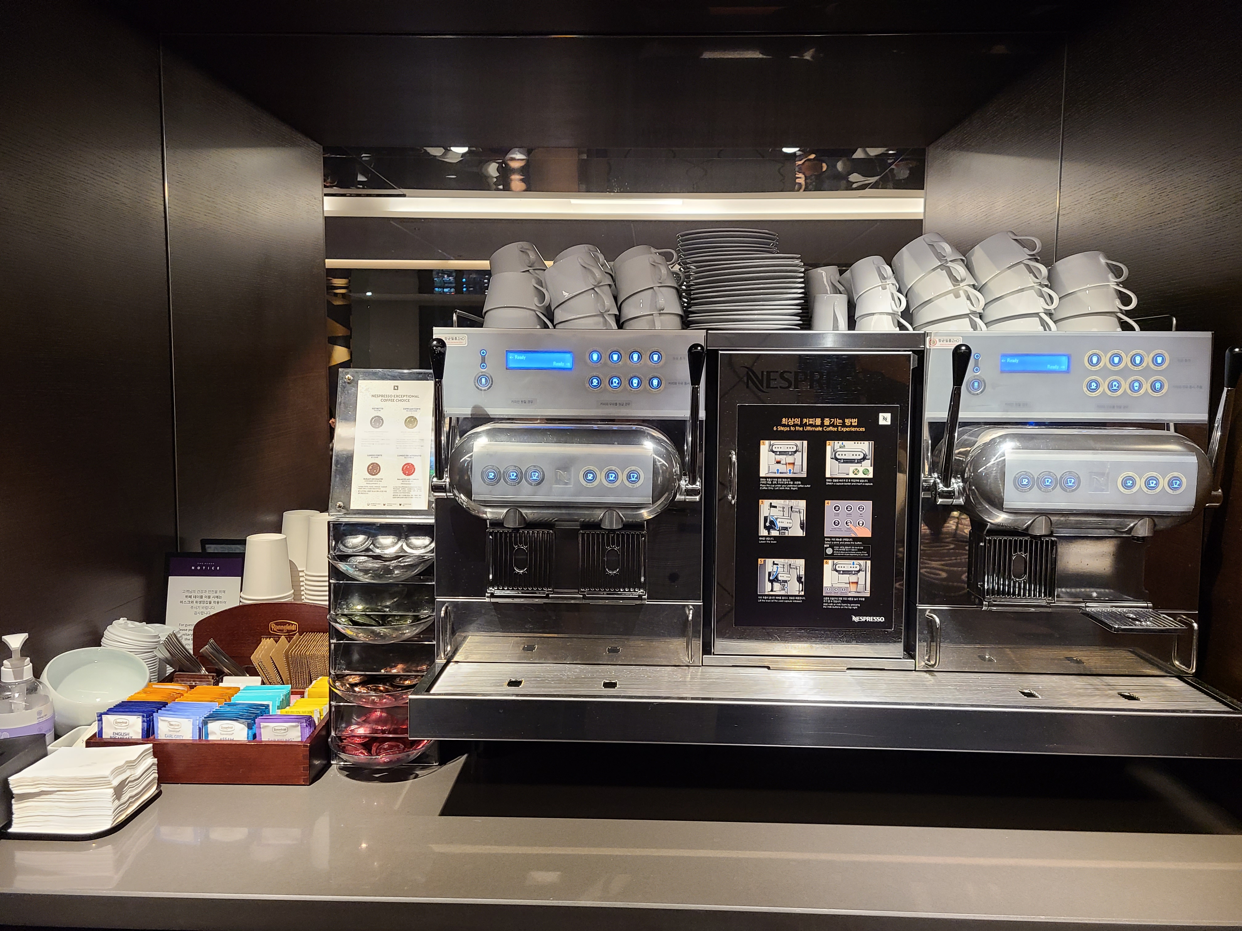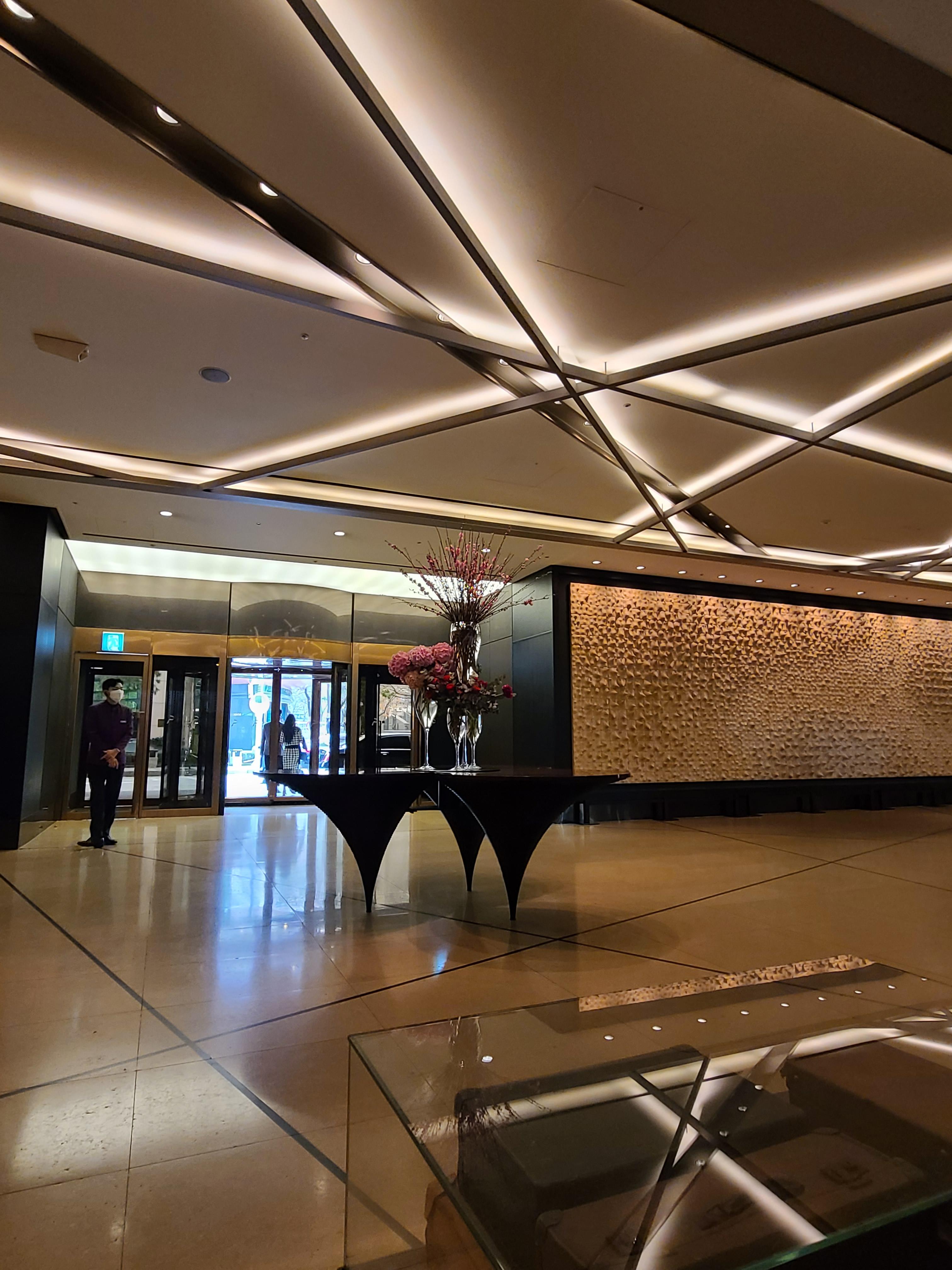 룸에 대한 기대감이 낮아서인지 문 앞에서부터 고급스러운 느낌이 느껴졌다. 건물 사이 뷰일까 염려했는데 창 밖으로 보는 뷰도 하늘이 예뻐서 만족스러웠다. 공간이 넓지는 않았지만 분리되어 있는 점이 좋았다. 미니 바 냉장고에는 음료나 스낵은 없었다. 필요 시에 주문하면 룸에서 서비스를 받을 수 있다고 했다. 욕실 어메니티는 몰튼 브라운으로 준비되어 있었고, 욕조와 샤워부스도 분리되어 있는 게 좋았다(실제로 욕실에서 욕조와 샤워부스를 이용하지는 않았다)