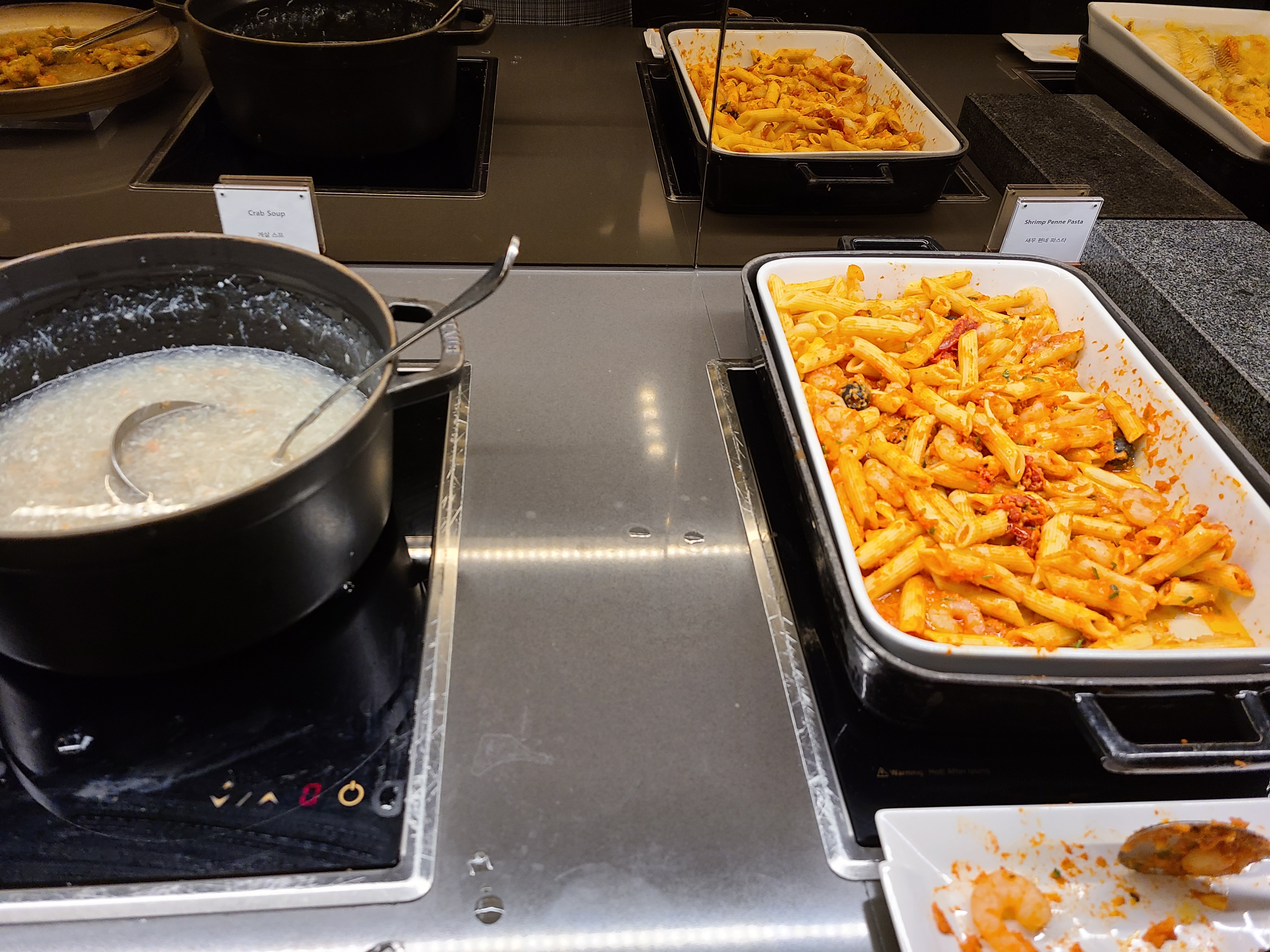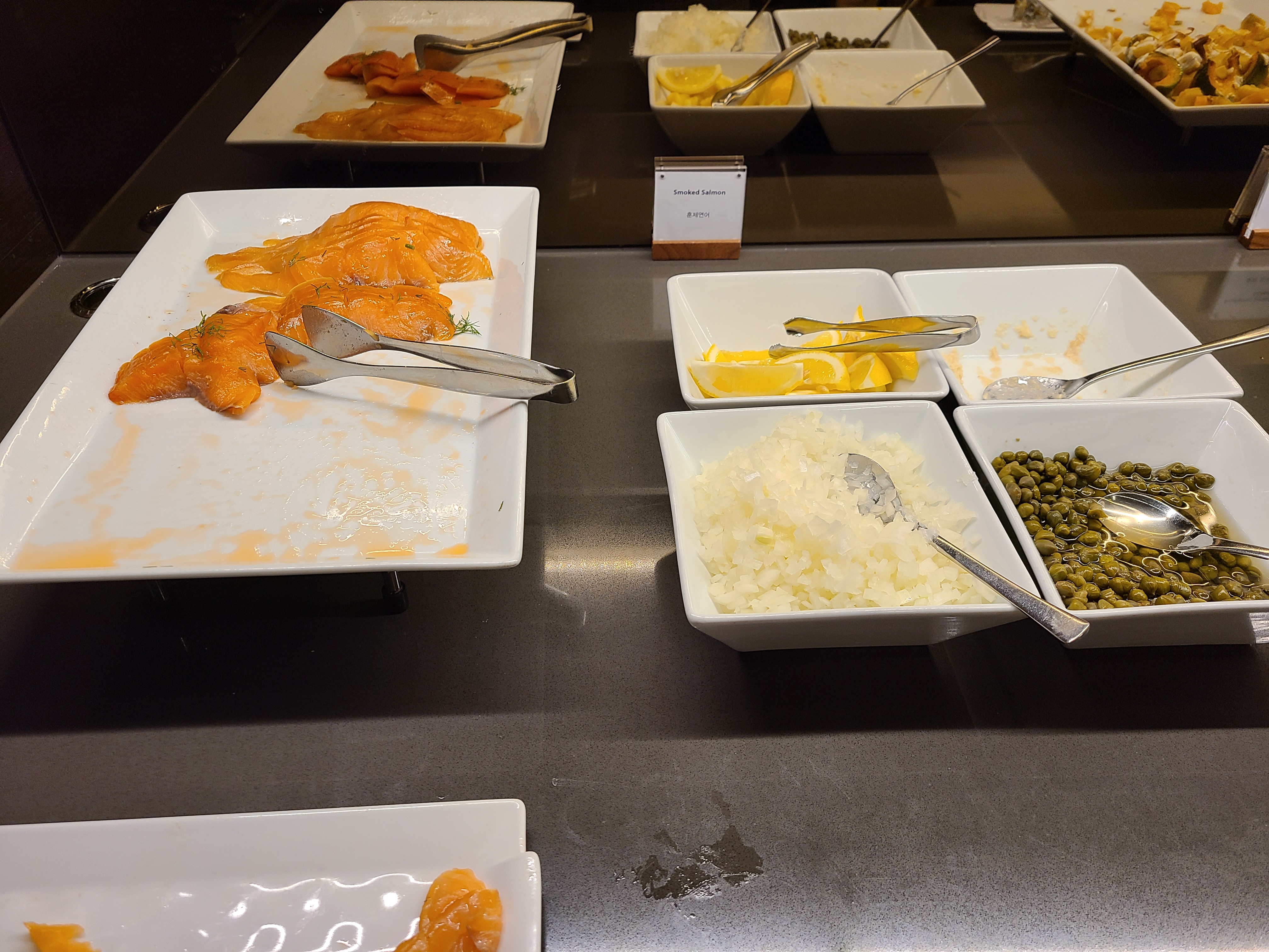 수영을 했는데도 불구하고 저녁 생각이 크지 않았지만 이브닝 칵테일 파티를 누리기 위해 클럽라운지 5층으로 이동했다. 클럽라운지에 들어가니 애프터눈티 보다 한 코너가 더 열려 있었다. 음식 종류도 다양했고, 한식도 준비되어 있었다. 샴페인과 함께 저녁을 먹으며 도시 뷰를 즐겼다. 우리 집 식구와 이브닝 칵테일을 즐기고 룸으로 돌아와 푹신한 침대에서 꿀 잠을 잤다.