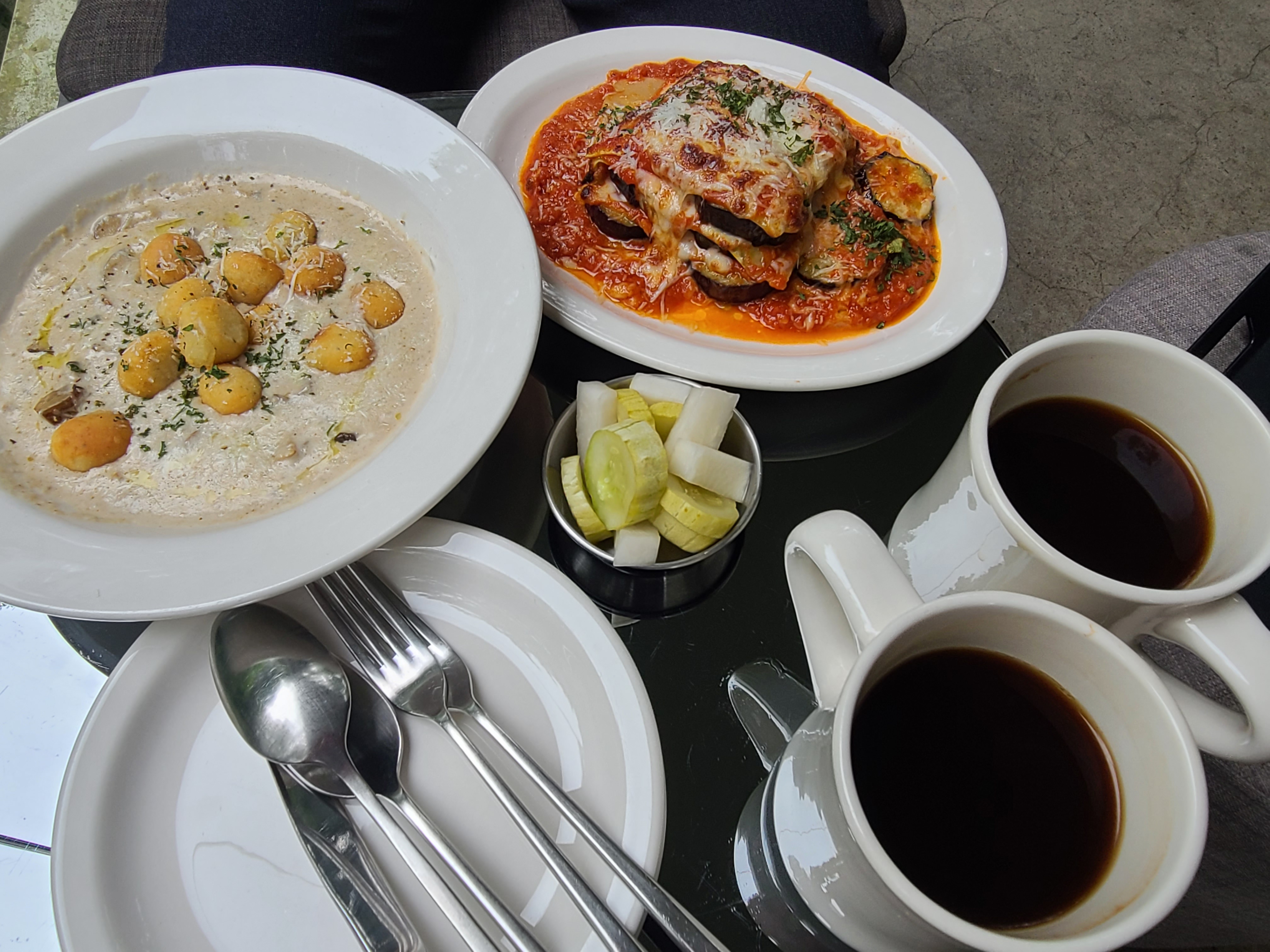 브런치 메뉴로 버섯 크림 뇨끼(19,000원)와 가지 라자냐(17,000원)를 선택하다.