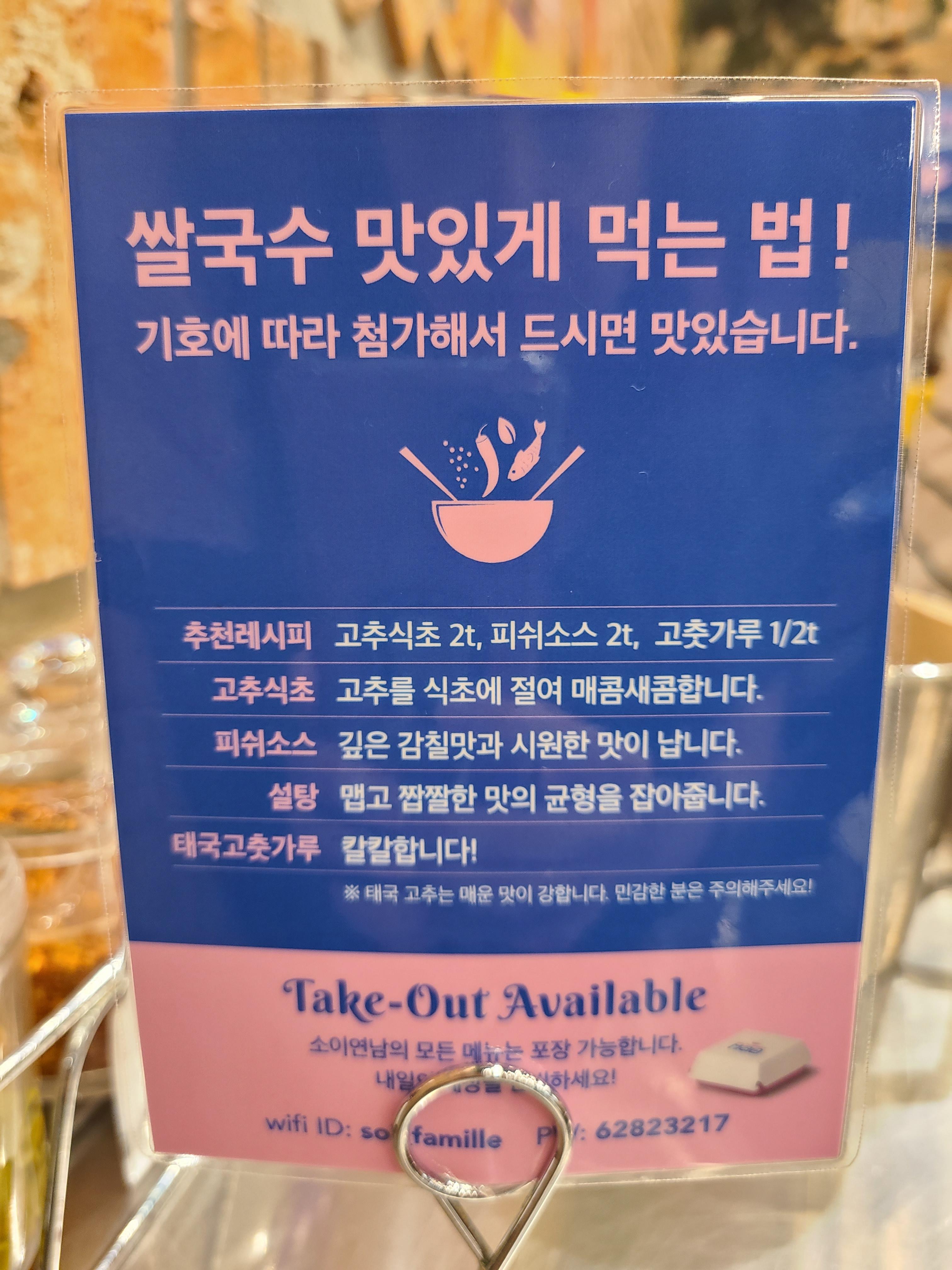 음식이 준비되기 기다리며 매장 이곳저곳을 살펴보기 시작했다. 소이연남의 맛있는 쌀국수를 집에서도 즐길 수 있게 소고기국수, 똠얌쌀국수 냉동제품과 고춧가루, 피쉬소스, 라임소스와 같은 향신료도 구매할 수 있게 준비되어 있었다. 네이버 쇼핑에서도 구매할 수 있다니 한 번쯤 주문해 봐야겠다는 생각이 들었다.