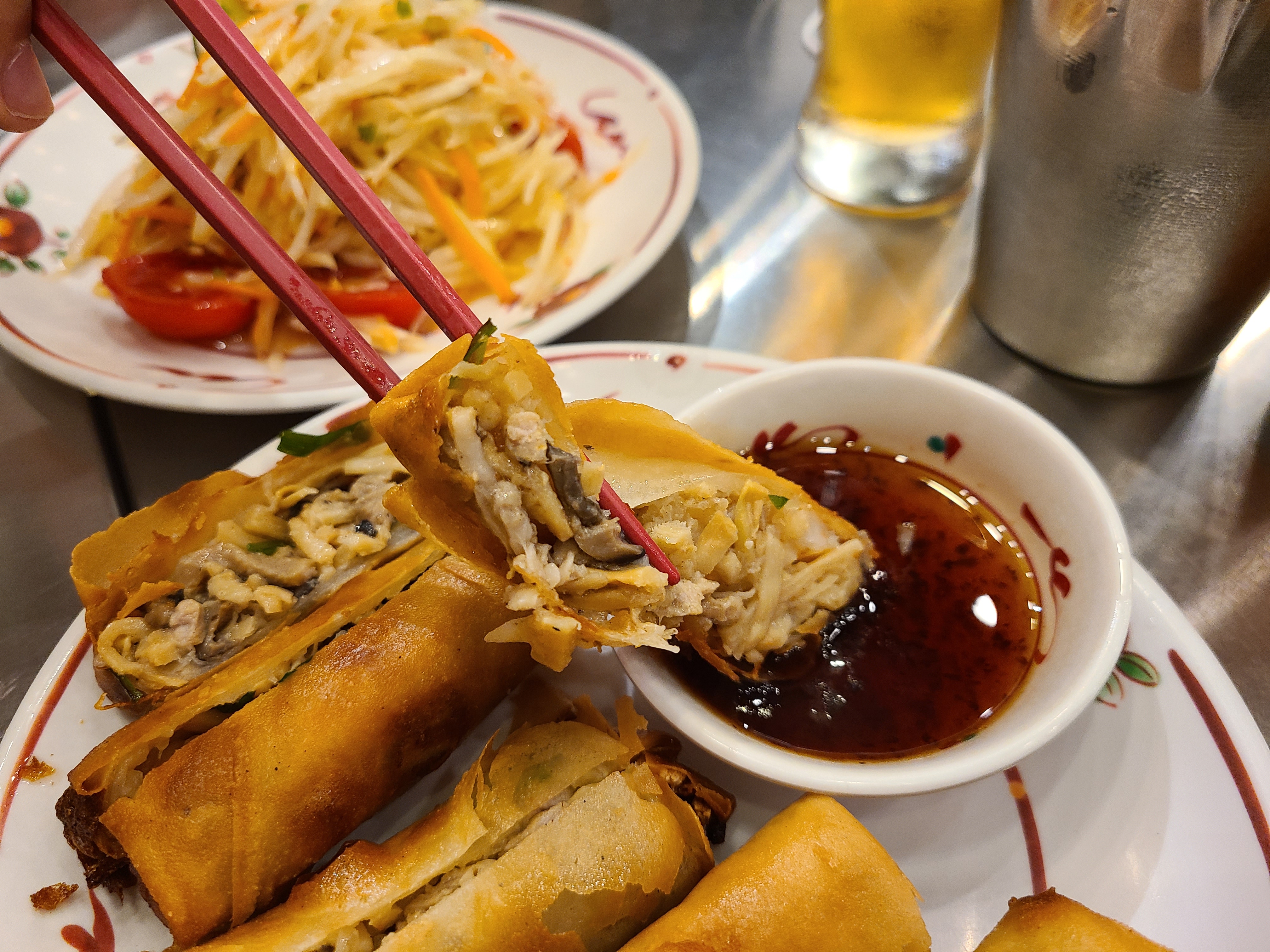 쏨탐에 이어 소이뽀삐야가 나왔다. 새우, 돼지고기, 버섯, 죽순이 바삭하게 튀겨져서 나온 이 맛이란 글을 쓰는 지금도 다시 먹고 싶다는 생각이 든다. 소이뽀삐야를 먹고 맥주를 마시니 정말 꿀맛 같았다. 우리 집 식구도 소이뽀삐야 한 입을 베어 물더니 맥주 한 모금을 들이켰다.