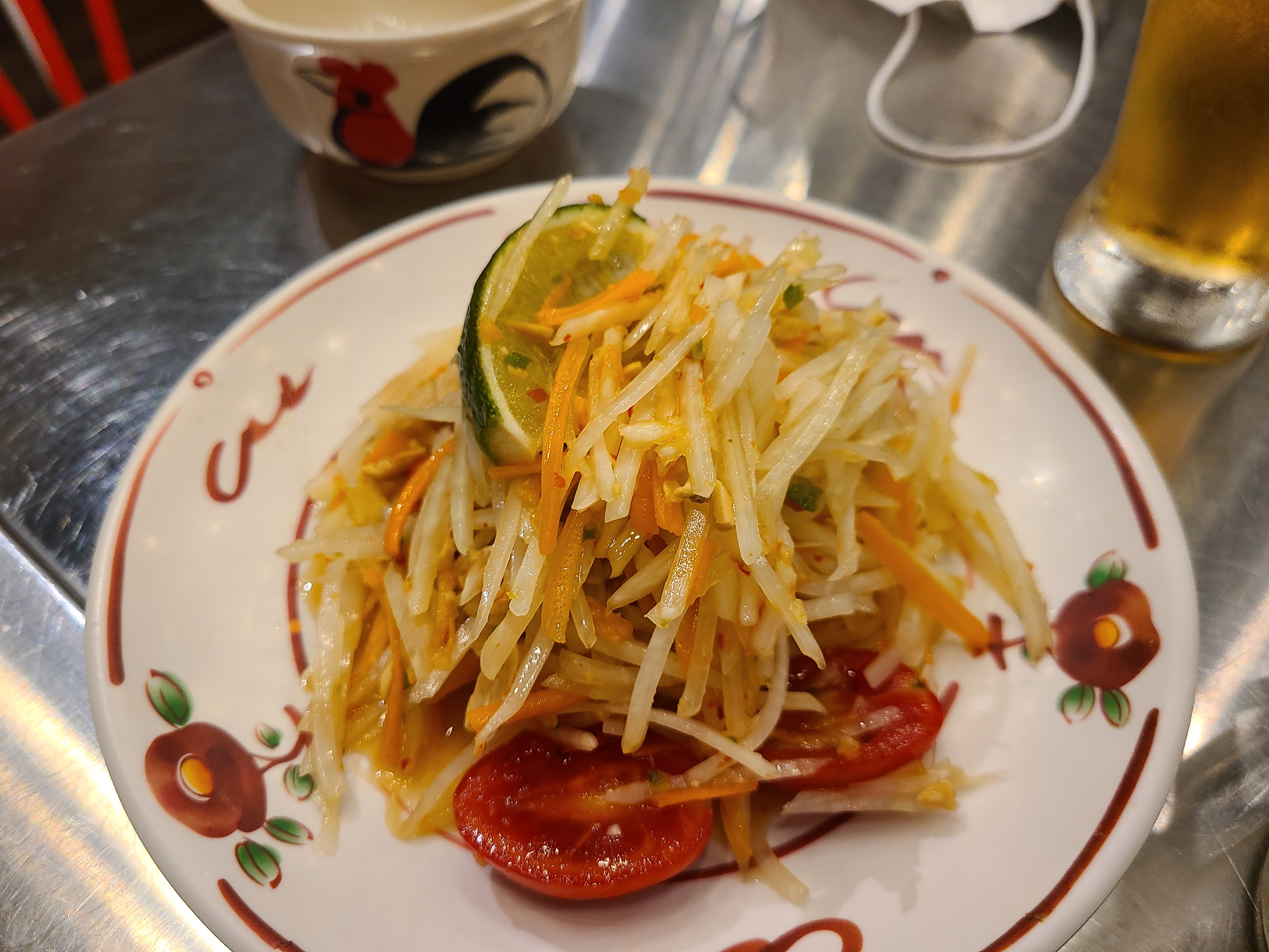 드디어 쏨땀이 먼저 나왔다. 소이연남에서 먹는 쌀국수가 느끼한 맛은 없지만 쏨땀과 함께 쌀국수를 먹으면 더욱 깔끔한 맛을 즐길 수 있기에 쏨땀 주문을 추천한다. 유난히 쏨땀을 좋아하는 우리 집 식구는 비주얼에 한번, 그 맛에 한번 감탄했다.