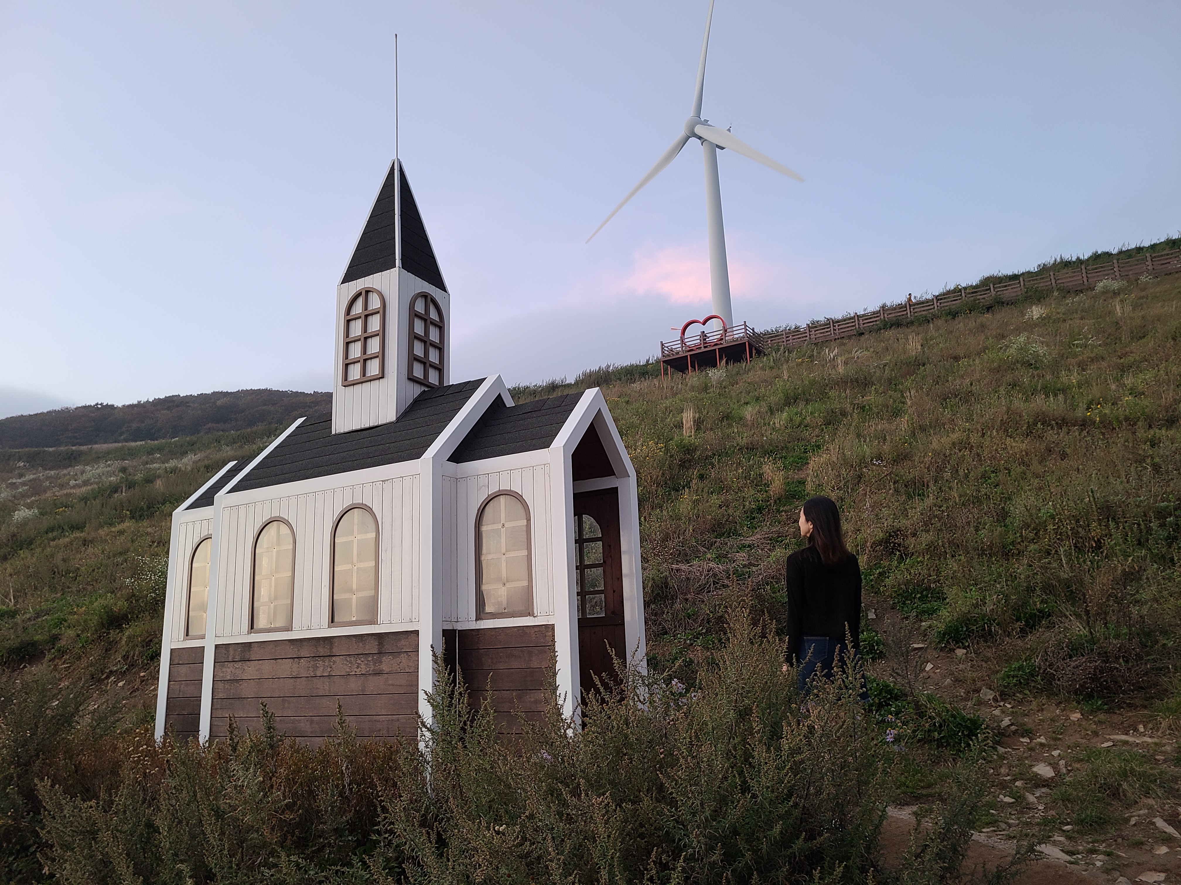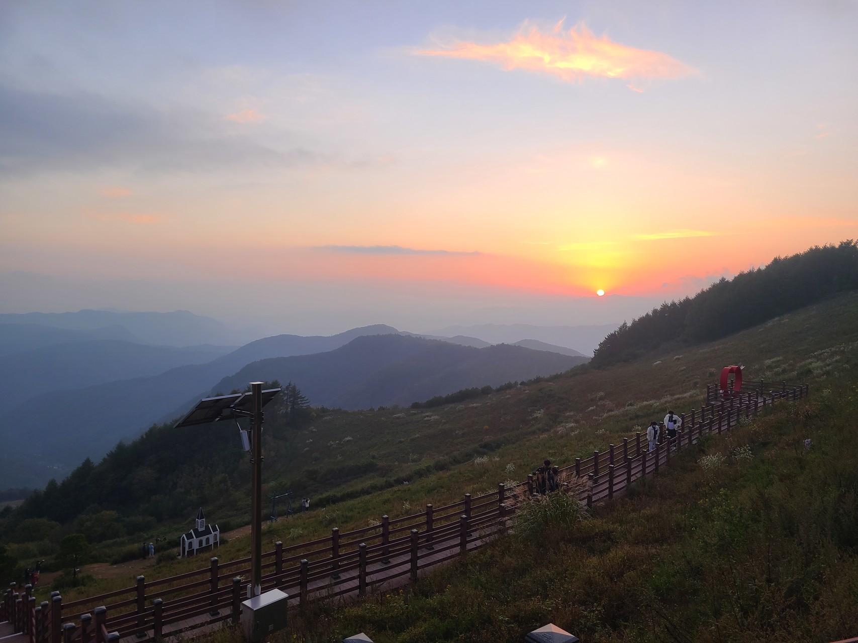 첫 번째 장소로 소개할 곳은 육백마지기이다. 늦여름 어느 날 갑작스레 떠났던 육백마지기, 이곳은 연애시절부터 우리 집 식구가 늘 다녀오고 싶어 했던 장소이다. 대중교통을 이용해서 가기는 어려운 곳이었고 결혼 이후 늦여름 일몰 시간에 방문하게 되었다. 일몰의 경치도 너무 좋았지만 사진을 찍기에 적합한 시간대는 아니었다. 사진 촬영을 위해 방문한다면 데이지 꽃이 만개 한 6월 말 -7월 초 낮 시간을 이용하기를 추천한다. 사진을 찍을 만한 장소로는 미니 교회와 무지개색 의자를 추천하고 싶다.