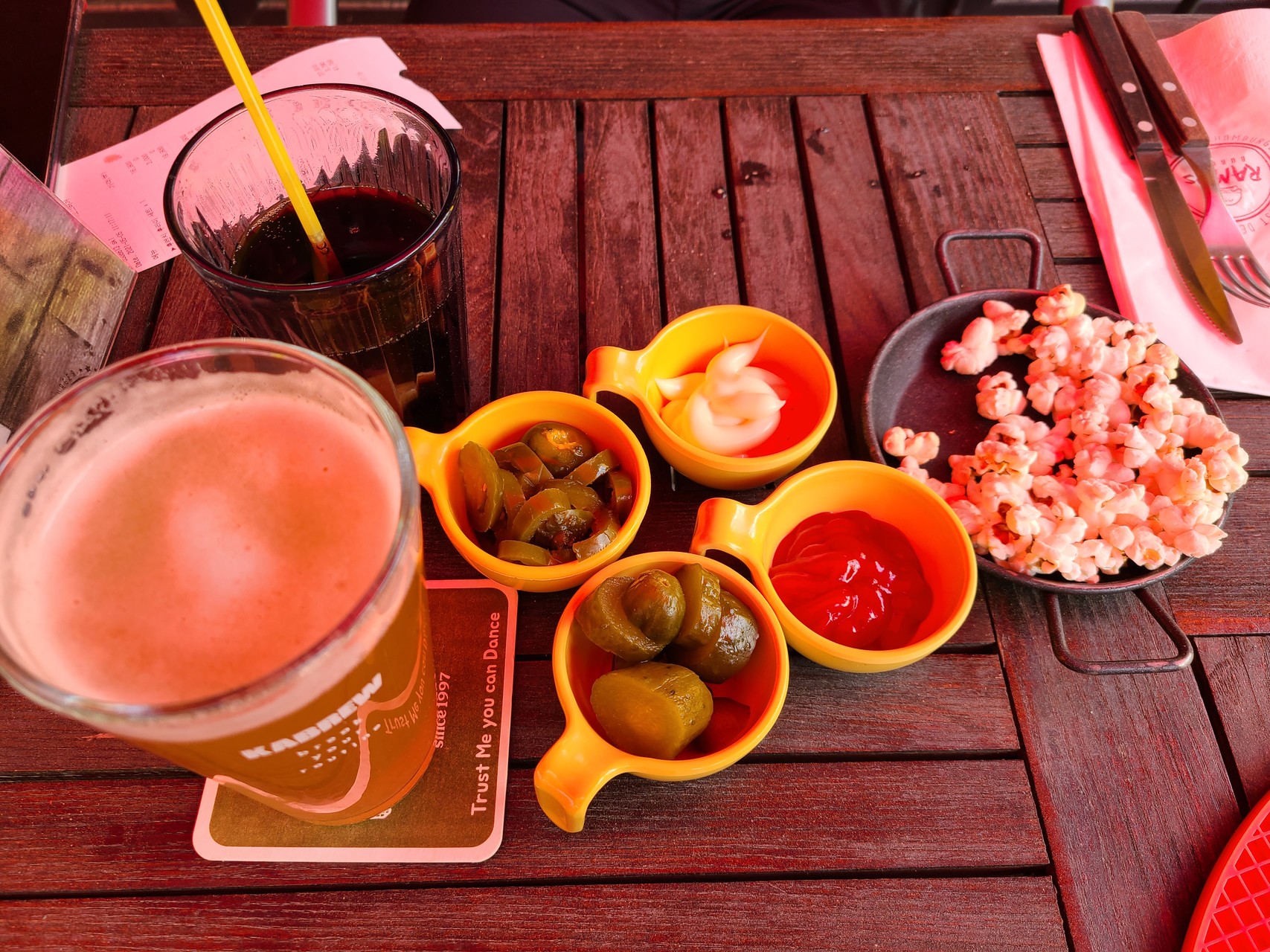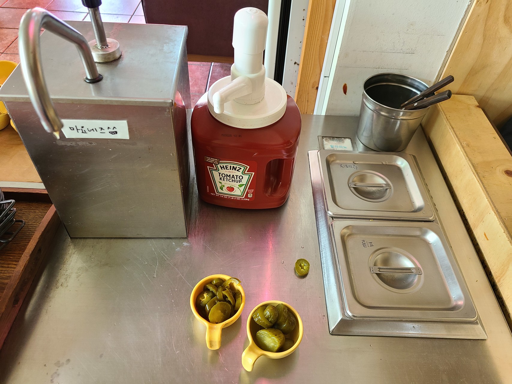 셀프바에는 팝콘, 피클, 할라피뇨, 마요네즈 소스, 토마토소스가 비치되어 있었다. 버거가 나오기 전 팝콘과 피클, 할라피뇨를 가져다 테이블 위에 세팅했다.