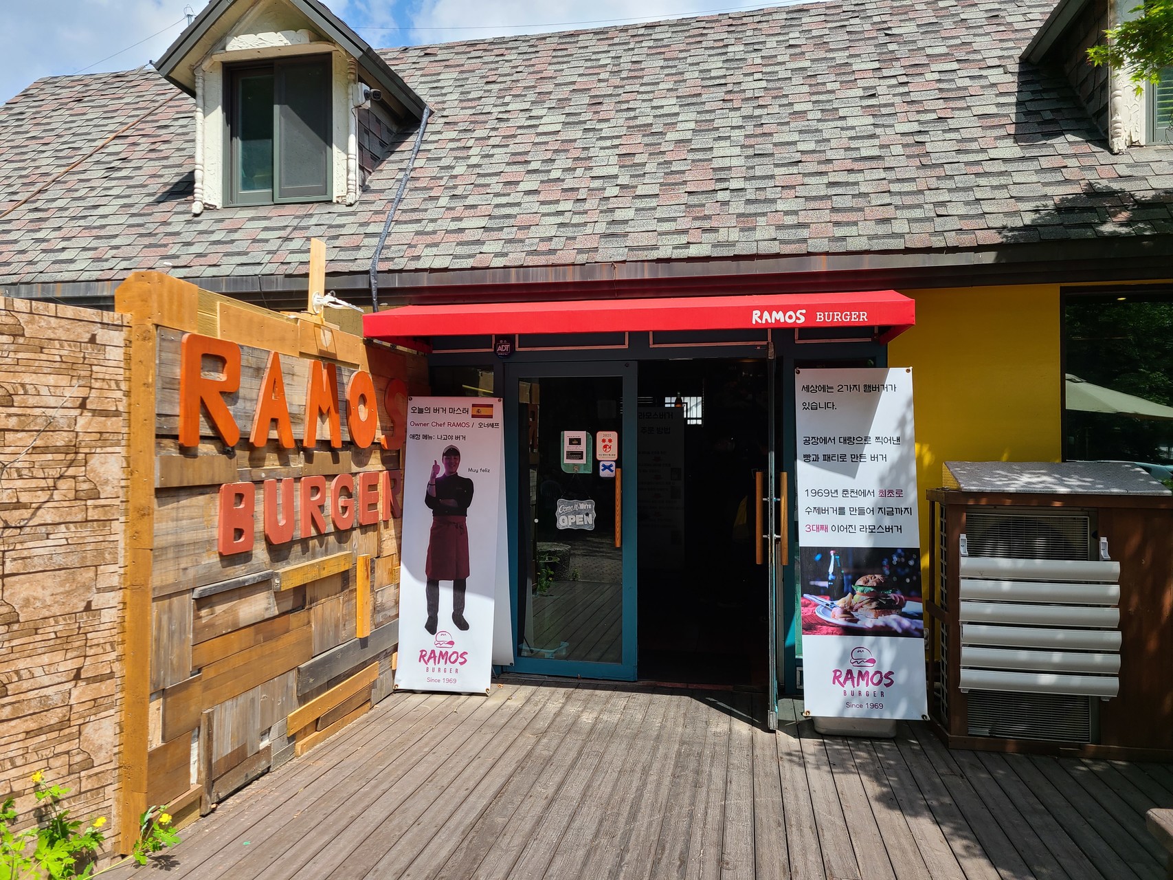 라모스버거는 춘천에서 3대째 운영되고 있는 수제버거집이라고 한다. 운영한지가 50년이 넘었다니 그 맛이 더욱 기대되었다. 외관은 미국 외곽에 있는 음식점 같았다. 하루에 두 번 직접 구운 빵을 버거 번으로 사용한다는 이야기를 듣고 갔는데, 입구에 들어가자 버거 번을 만들고 있는 모습이 보였다.