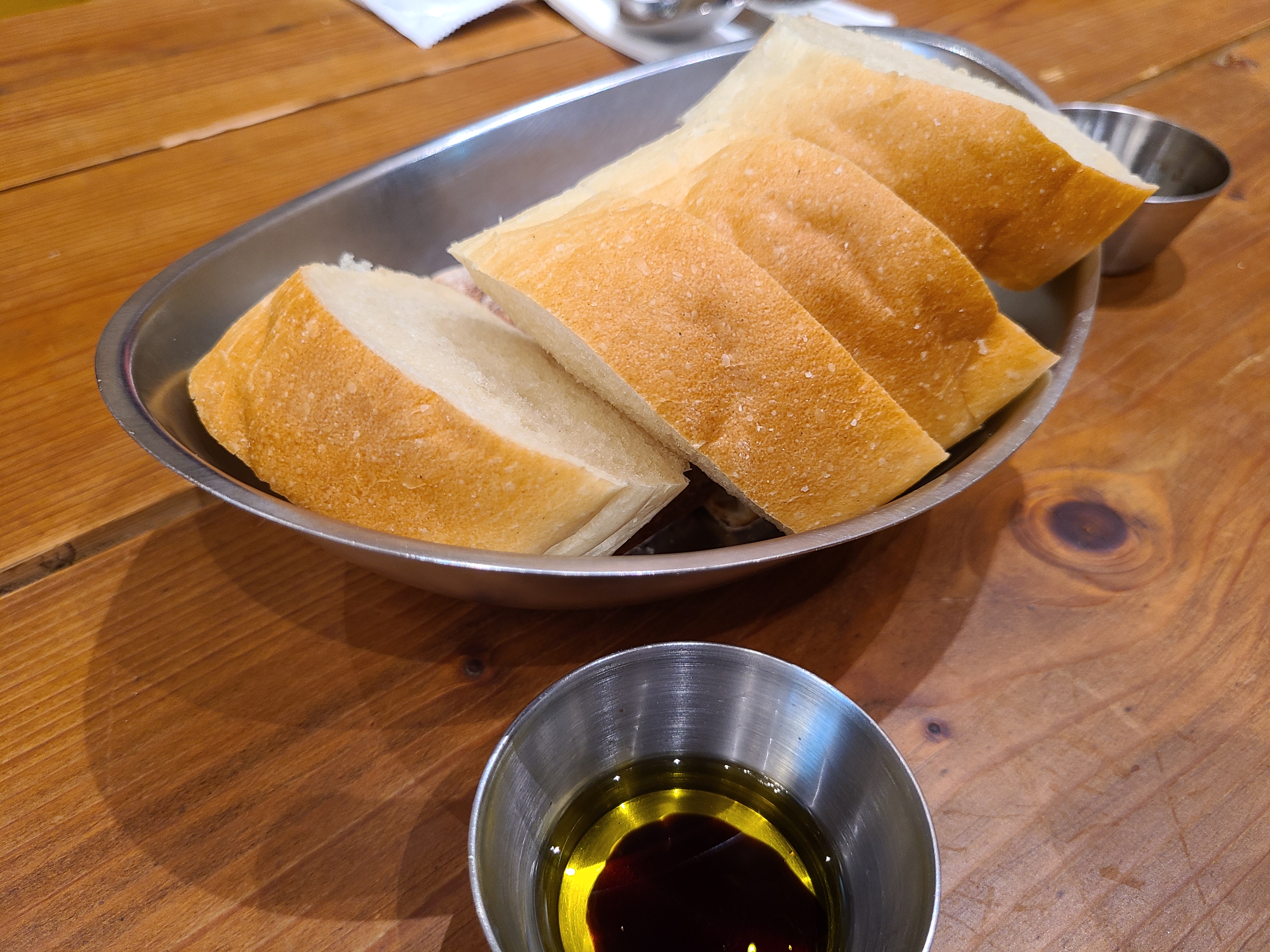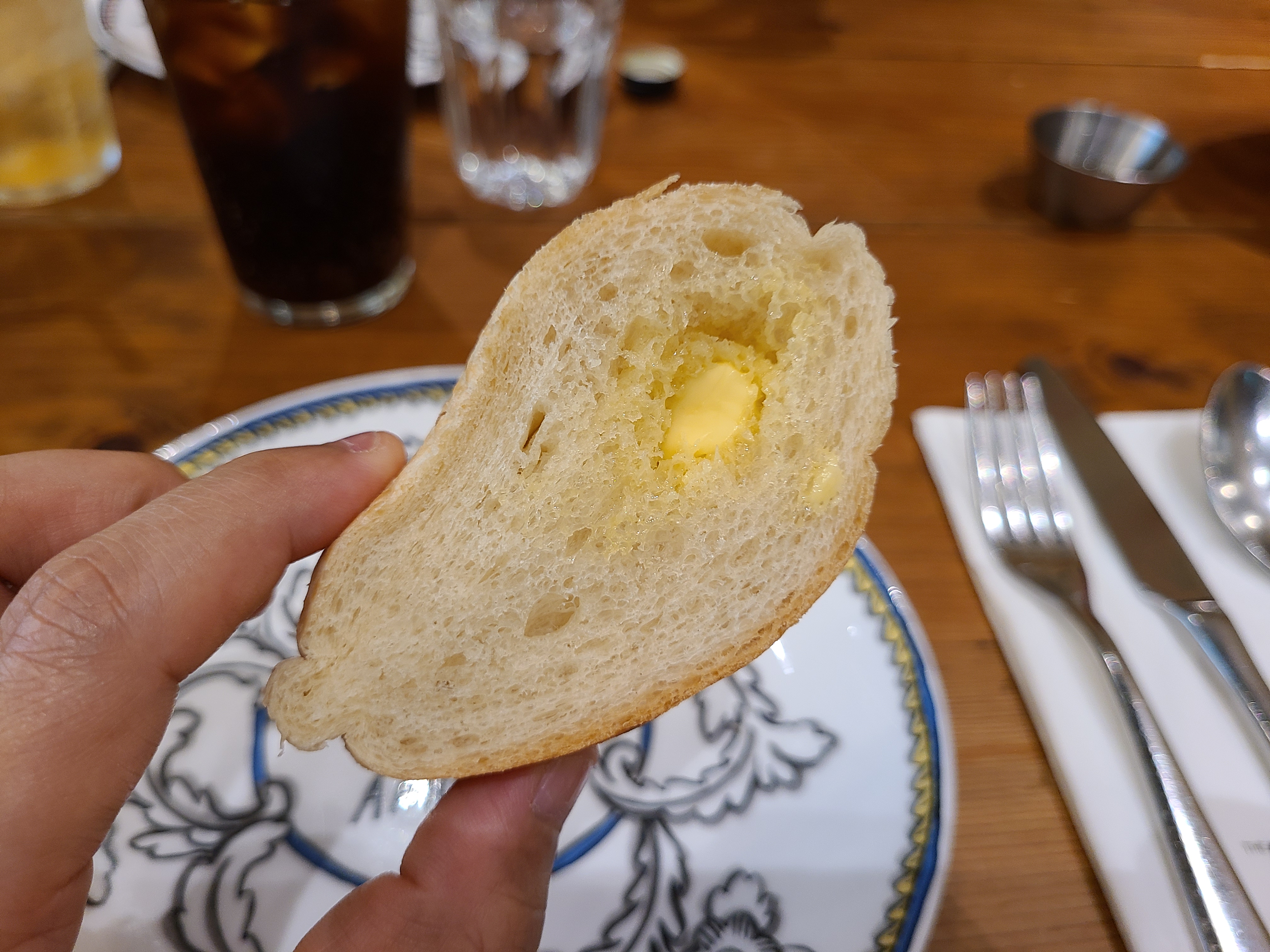 세팅된 접시와 서빙될 때마다 받아드는 접시가 예뻐 기분이 더욱 좋아졌다. 주문한 음료를 먼저 받았다. 내가 주문 한 콤부차 오리지널, 최근 다이어트 음료로 인기가 많은 것 같아 주문했는데 개인적으로는 일반 탄산수가 더 입맛에 맞았다. 그리고 바로 이어 식전 빵과 발사믹 올리브유 소스, 버터가 나왔다. 식전 빵은 따뜻하고 부드러웠고 입맛을 돋아주기에 충분했다.