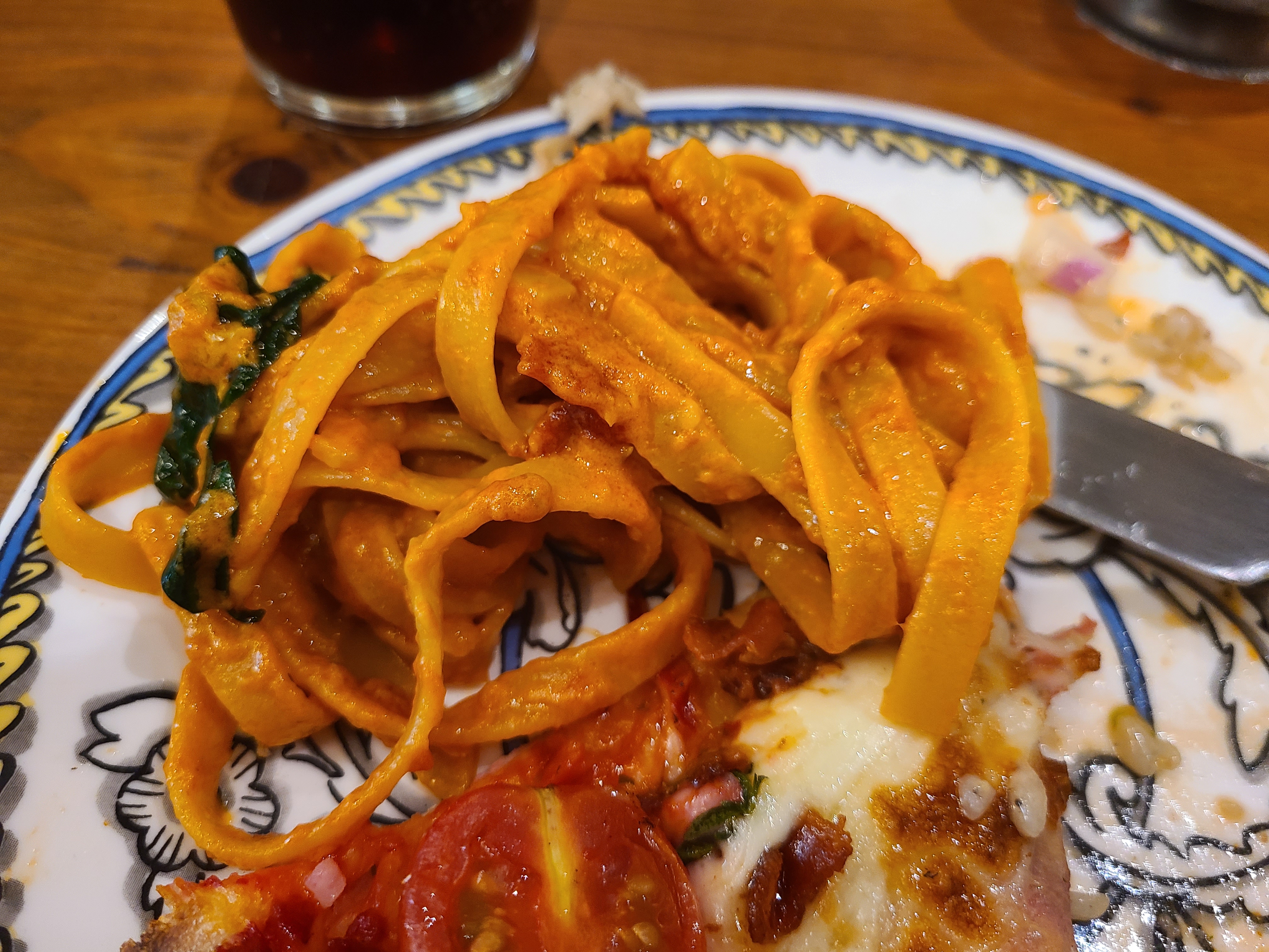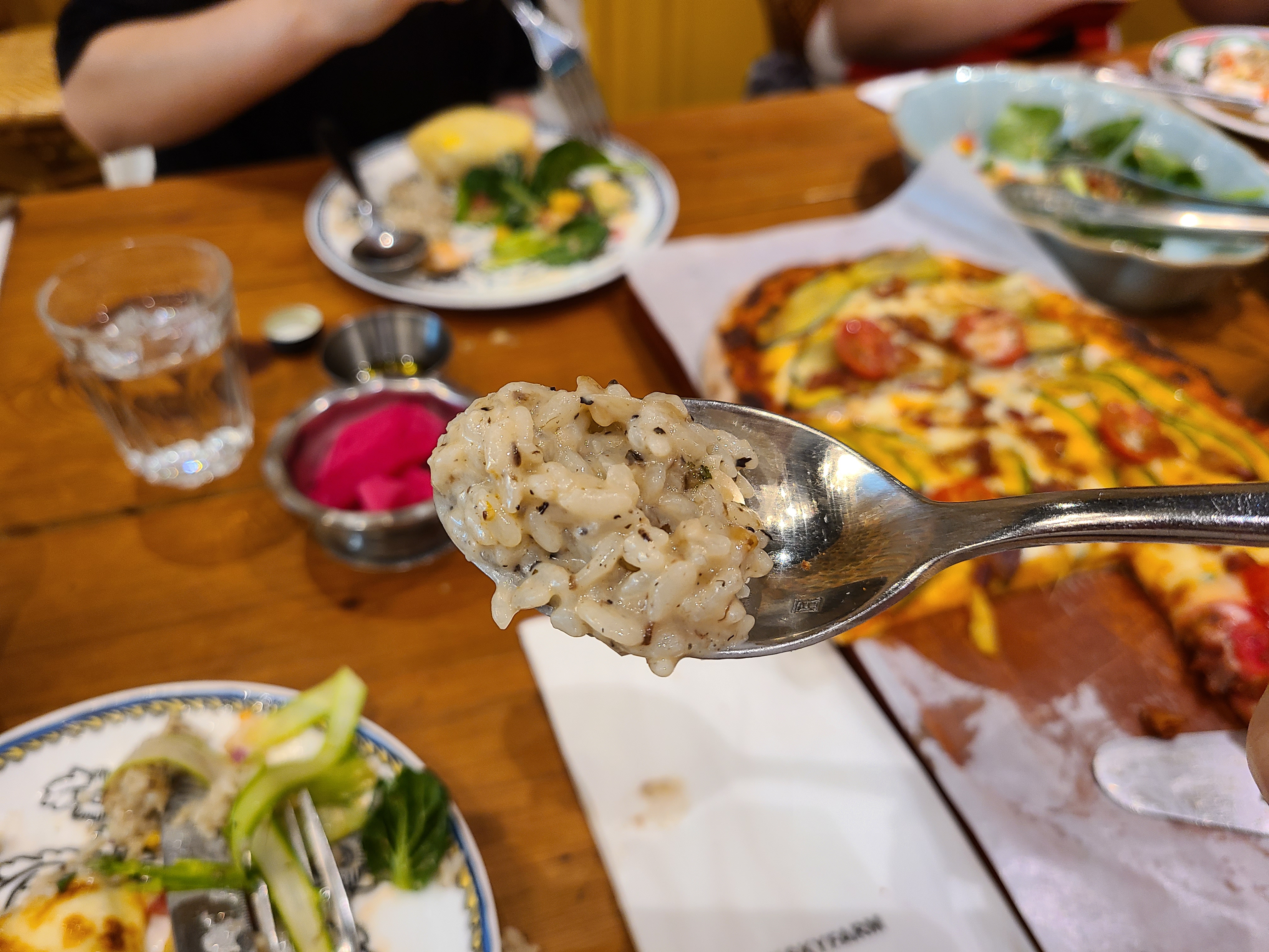 다음으로 콥 샐러드와 소스가 주문되었고, 콥 샐러드의 모든 재료가 굉장히 신선해보였다. 바로 이어 파스타와 리조또, 피자와 피클이 준비되었다. 모든 메뉴에 맛이 훌륭했다. 콥 샐러드에는 레드 빈과 옥수수, 아보카도, 케이준 치킨 양이 모두 적절했다. 평소 소스가 충분히 면에 스미지 않는 것 같아 페투치니 면을 선호하지 않는데 면의 익기는 적당했고 소스가 면안에 잘 스며있어 로제 소스의 맛을 충분히 즐길 수 있었다. 스테이크 리조또 위에 올려진 스테이크의 경우 약간 질긴 듯한 느낌이 들었지만, 리조또 자체는 크림소스와 트러플 향이 잘 어우러져 있어 풍미가 좋았다. 마지막으로 피자 이곳이 왜 잠실 브런치 맛집이자 피맥 맛집이라고 부르는 이유를 알게 해줬다. 당장 맥주를 시키고 싶었지만 아침 시간대이기에 진정했다. 다음에는 피맥을 하러 방문해 보고 싶다. 4명 모두 주문한 메뉴 한 가지씩을 최애로 꼽았고, 만족스러운 식사를 마쳤다.
