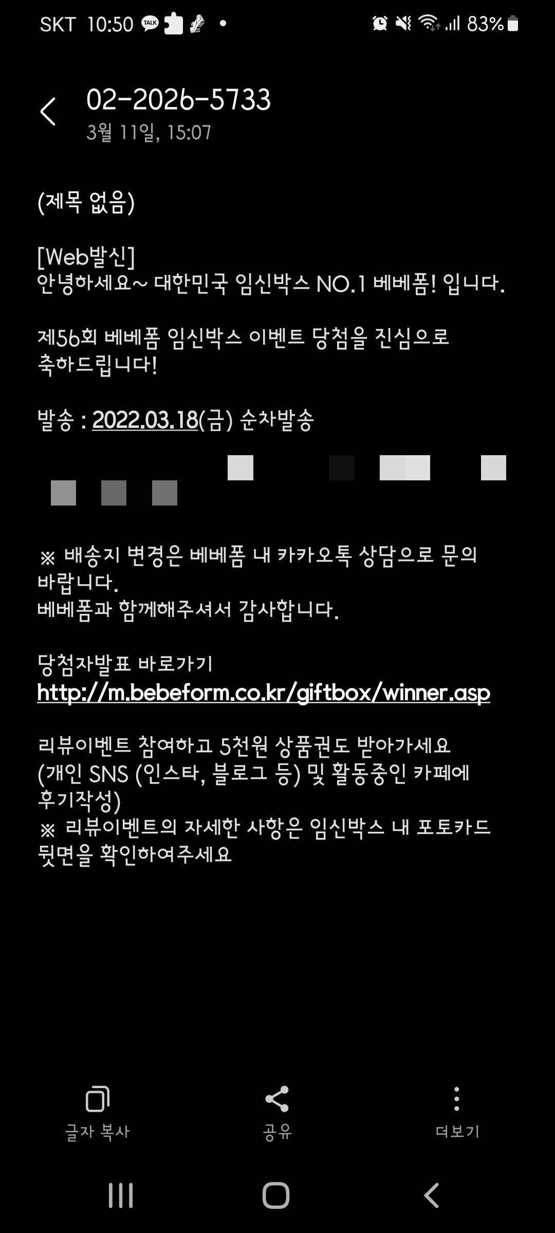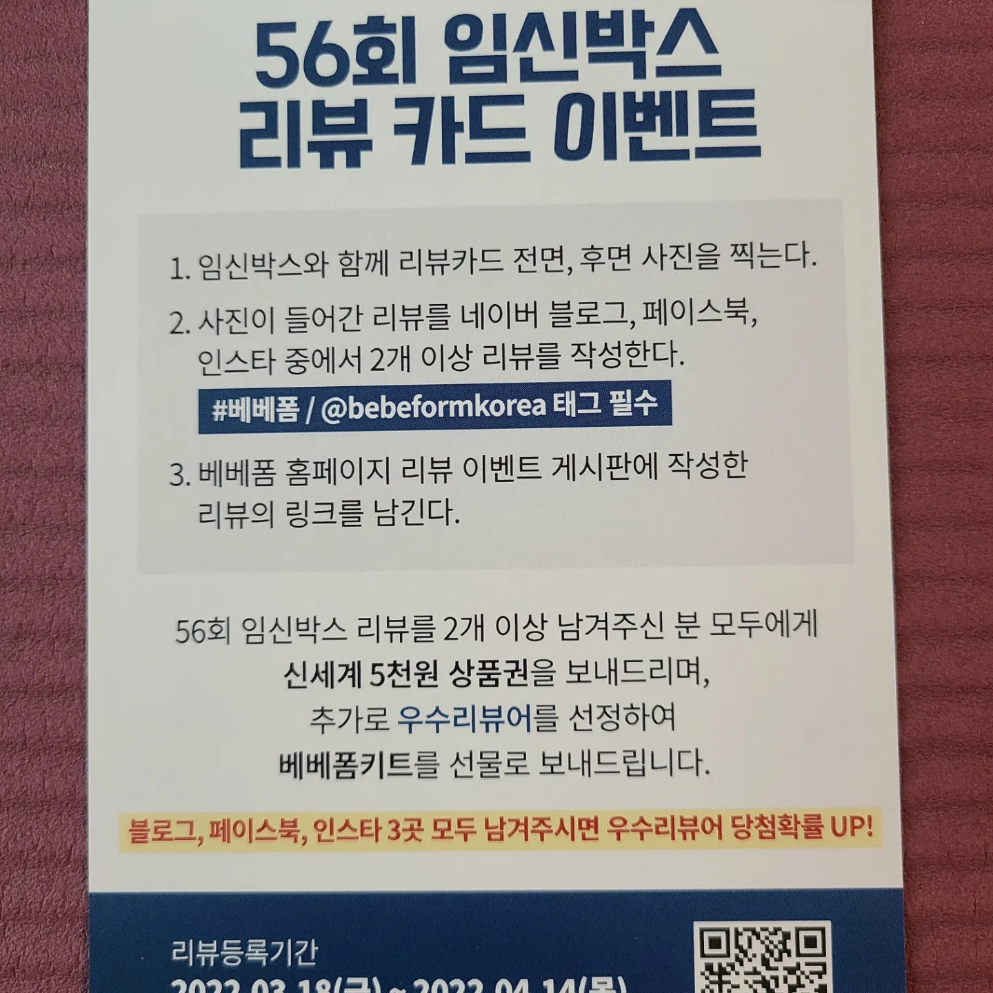 선물 같은 아이가 찾아왔다. 결혼 후 임신이 막연하게만 느껴졌고, 급하지 않다고 생각했지만 산전검사에서 난소 나이가 40대 중후반이라는 소리가 청천벽력 같았다. 그때부터 조급증이 발달했고 다행히 자연임신에 성공하여 지금은 임신 7개월 차에 접어들었다. 임신을 확인한 순간부터 많은 염려와 과정들이 있었지만 지금은 임신 중기의 안정감을 태동을 통해 느끼고 있다. 임신과 관련한 과정은 앞으로 차차 기록으로 남겨보려고 한다. 그전에 오늘은 '베베폼 임신 박스' 당첨 후기를 남겨보고자 한다. 나라는 사람은 참 이런 이벤트 당첨 운이 없는데 이렇게 당첨이 돼서 수령까지 하다니 매우 설레어었다.