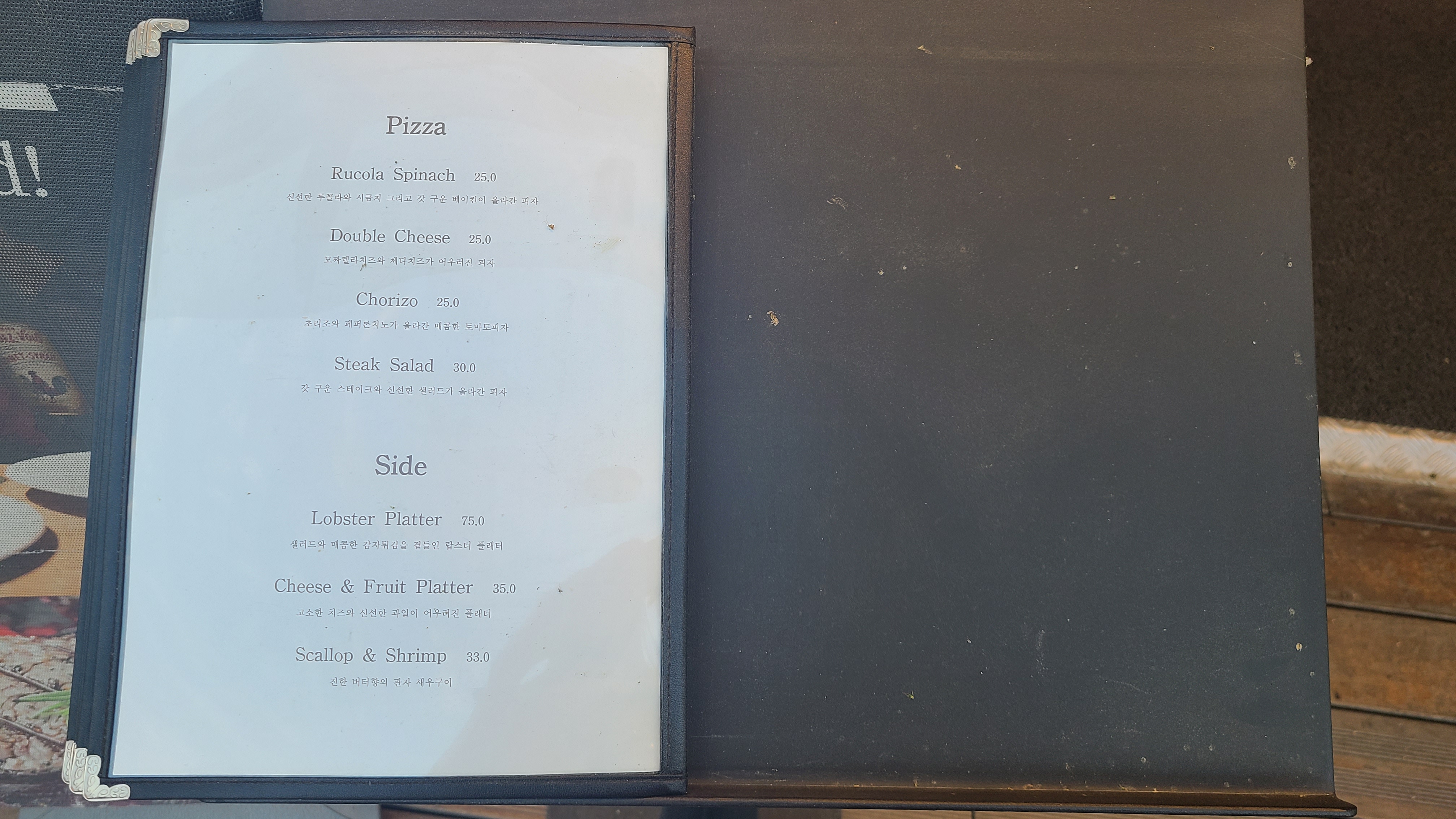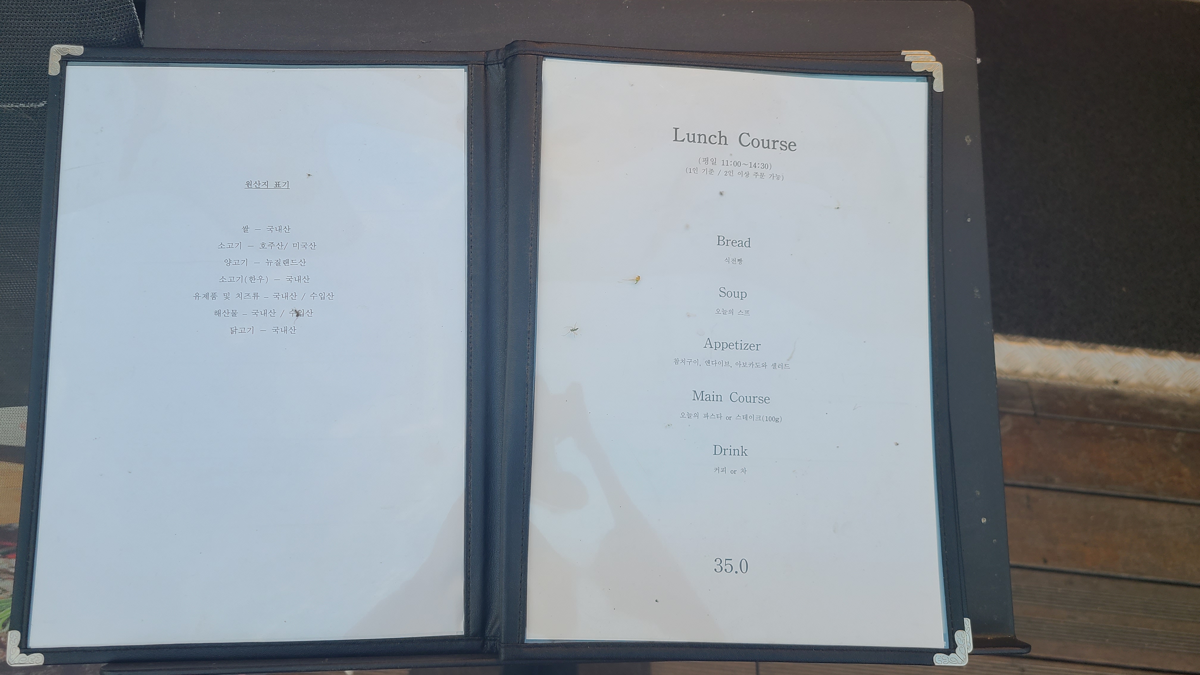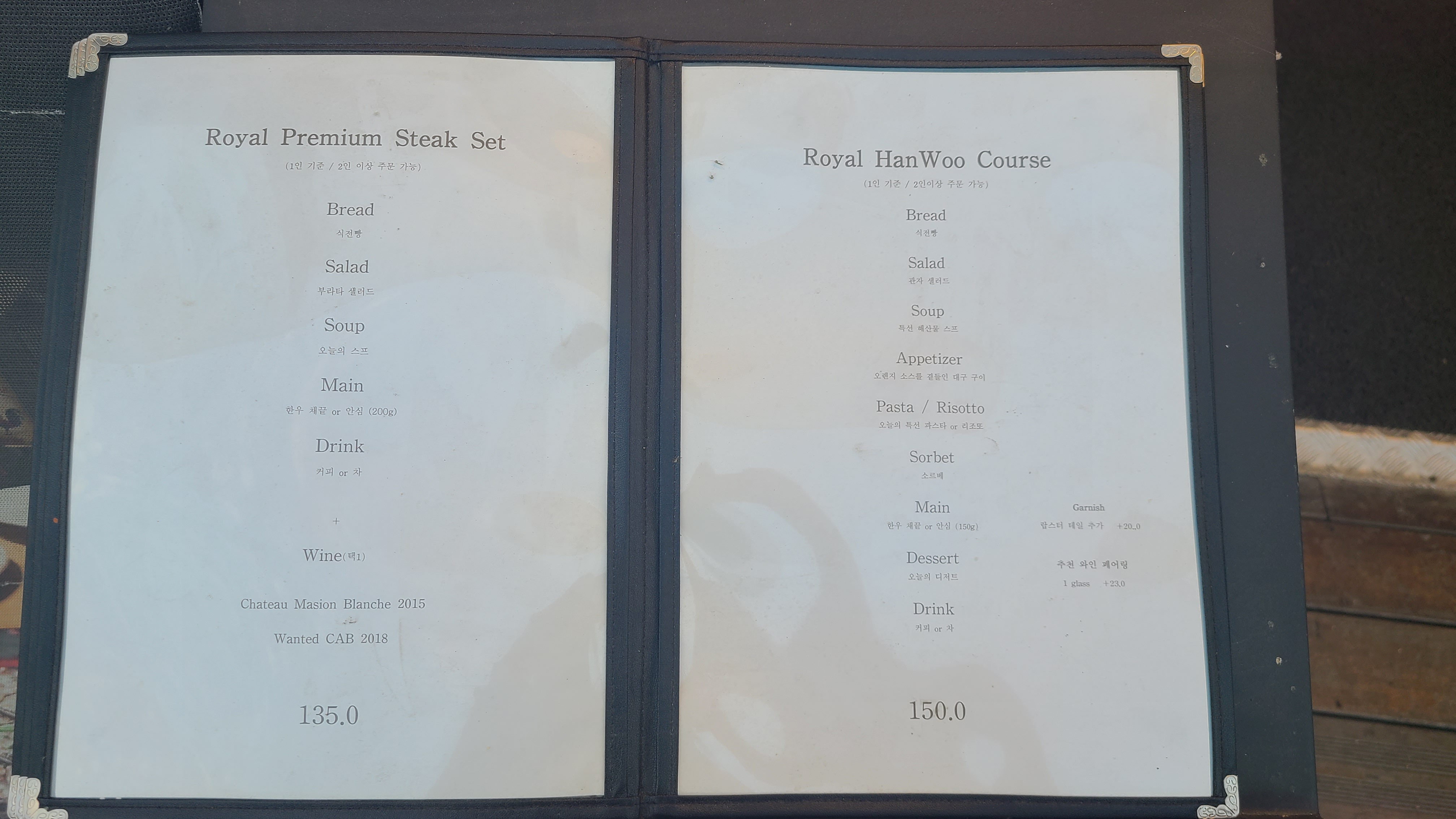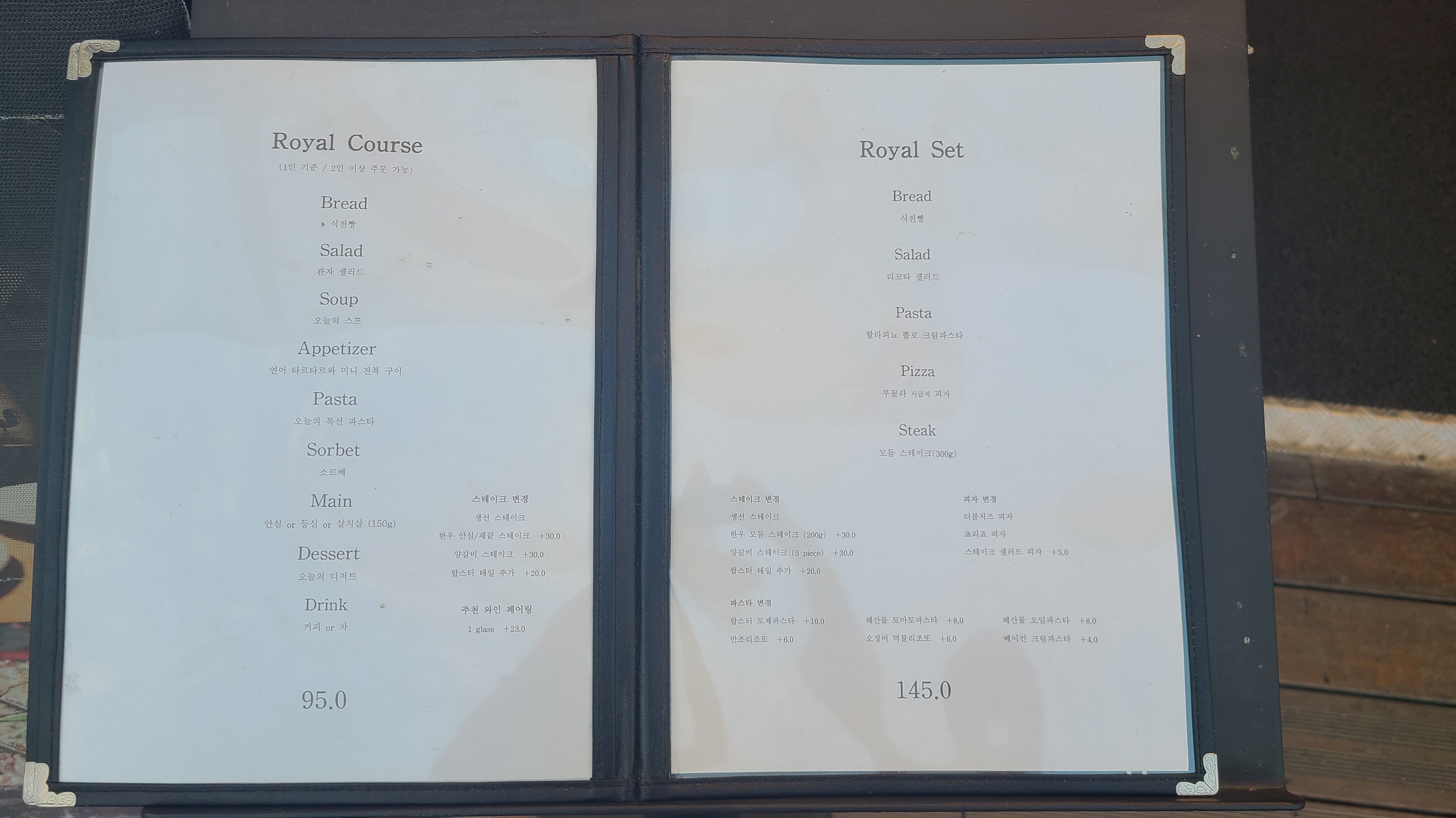오늘 이 뷰로 충분하다는 생각이 들었다. 더 스테이크하우스 피어 79 로열 스테이크는 저녁시간이 2부로 나누어져 있었는데 우리 집 식구와 나는 5시 - 7시 시간을 예약하고 이용했다. 너무 깜깜한 야경보다는 노을이 지는 시간대를 누리고 싶었는데 탁월한 선택이었던 것 같다. 자리에 앉아 메뉴를 보는데 런치의 구성과 가격이 합리적이라는 생각이 들었다. 한강에서 식사지만 가격 대가 너무 부담스럽지 않은 식사를 하고 싶었는데 가격이 착하다는 생각이 들었다. 우리 집 식구와 나는 로열 세트와 로열 코스 중에 고민을 하다 관자 샐러드가 포함된 로열 코스를 선택했다.