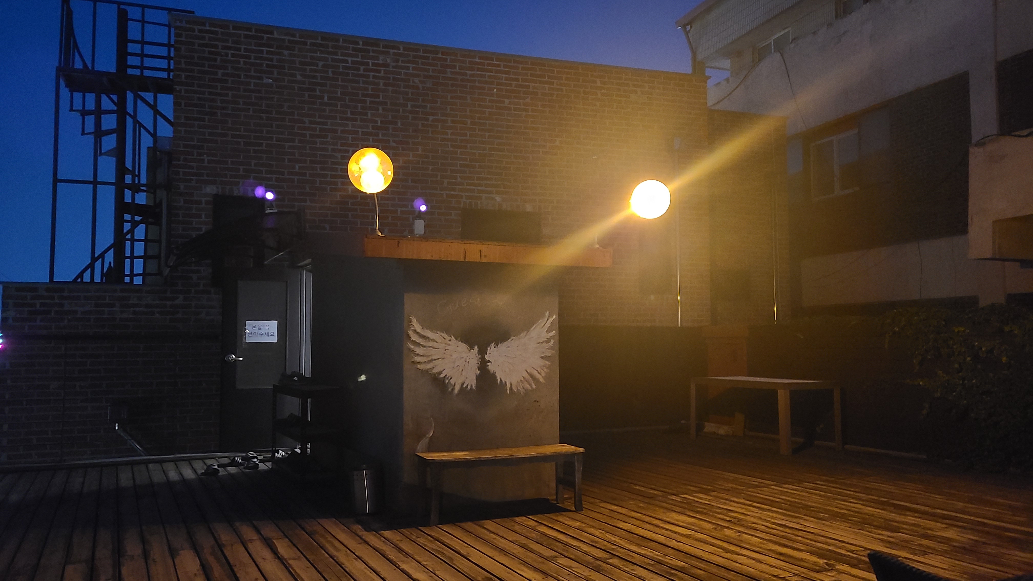 빵과 밀크셰이크를 먹고 우리는 바로 게스트하우스로 이동했다. 결혼 전에는 어딜 가든 숙소가 가장 중요했는데 우리 집식구와 결혼 이후 잠만 자는 숙소는 가성비를 따지며 50,000원이 넘지 않는 선에서 선택하고 있다. 그래서 선택한 이번 숙소는 동국 101호였다. 결재와 동시에 사장님으로부터 군산 여행 코스별 안내, 은밀한 군산 맛집, 게스트하우스 이용 안내 문자를 받게 된다. 당일 입실 전에도 상세한 입실 및 이용 안내를 받을 수 있었다. 사장님을 직접 뵙지는 못했지만 필요한 요청에 바로 회신해 주셨고 있는 동안 편안하게 머물렀다. 특히 옥상에서 우리 집식구와 음악을 들었던 시간이 너무 좋았다.
