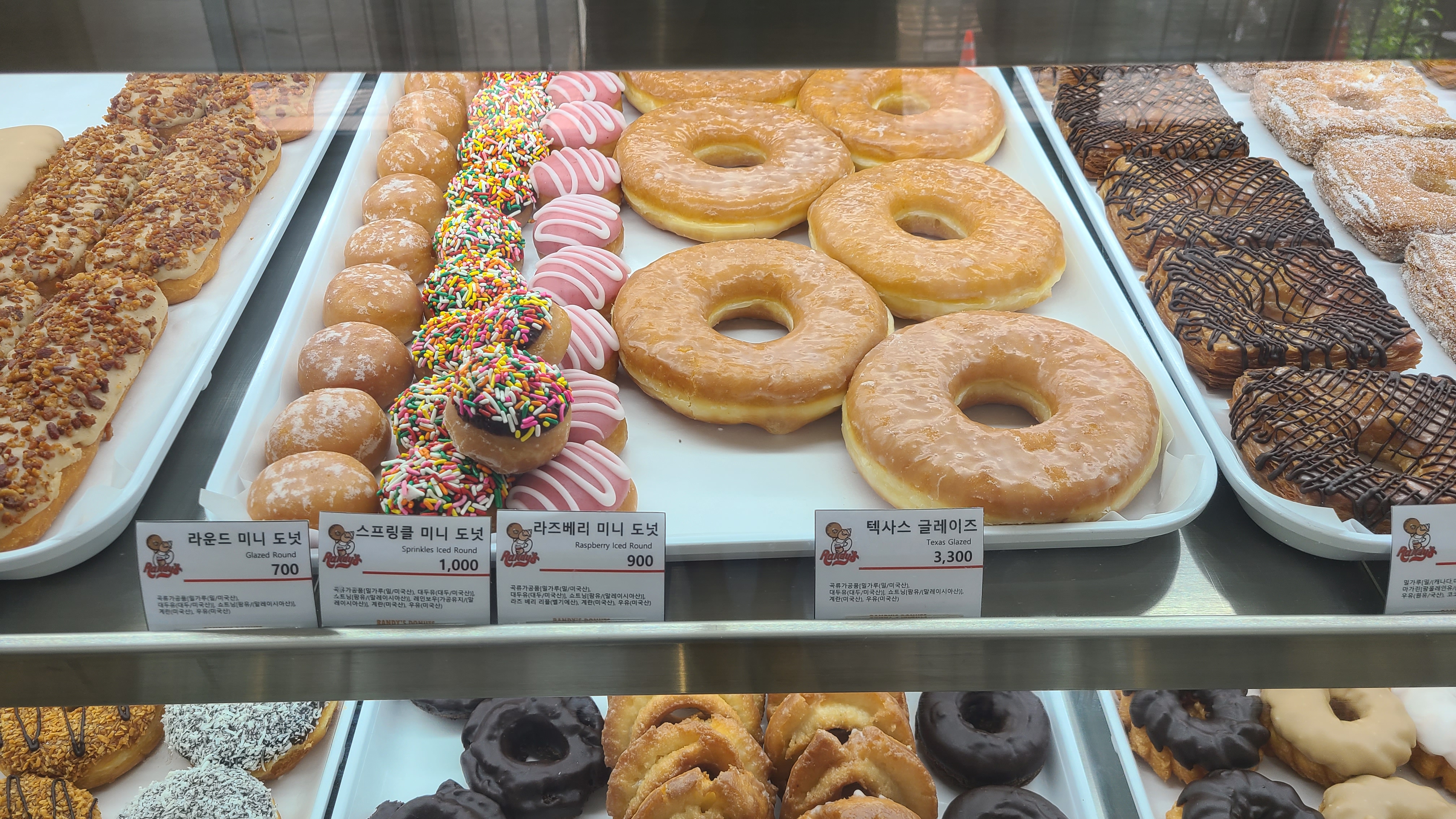 쇼케이스 안에 도넛을 보니 '더 많이 사갈 것을 8개만 주문했나?'라는 생각이 순간 들었다. 달콤한 도넛의 유혹을 뿌리치고 랜디스 도넛의 베스트 메뉴를 참고하여 Classic 라인에서 글레이즈 도넛 2개, Fancy 라인에서 버터 크럼 도넛, 커피 크럼 도넛, Premium 라인에서 누텔라 도넛 2개, 엔앰엔 도넛, 카라멜 코코넛 도넛까지 총 8개 도넛을 선택했다.